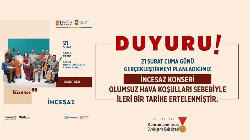 Büyükşehir Belediyesi tarafından organize edilen Cahit Zarifoğlu Kültür Sanat Sezonu etkinlikleri çerçevesinde sahne alması planlanan İncesaz konseri, hava muhalefeti nedeniyle ertelendi. Yetkililer, konserin ileri bir tarihte gerçekleştirileceğini ve yeni takvimin yakında duyurulacağını açıkladı.