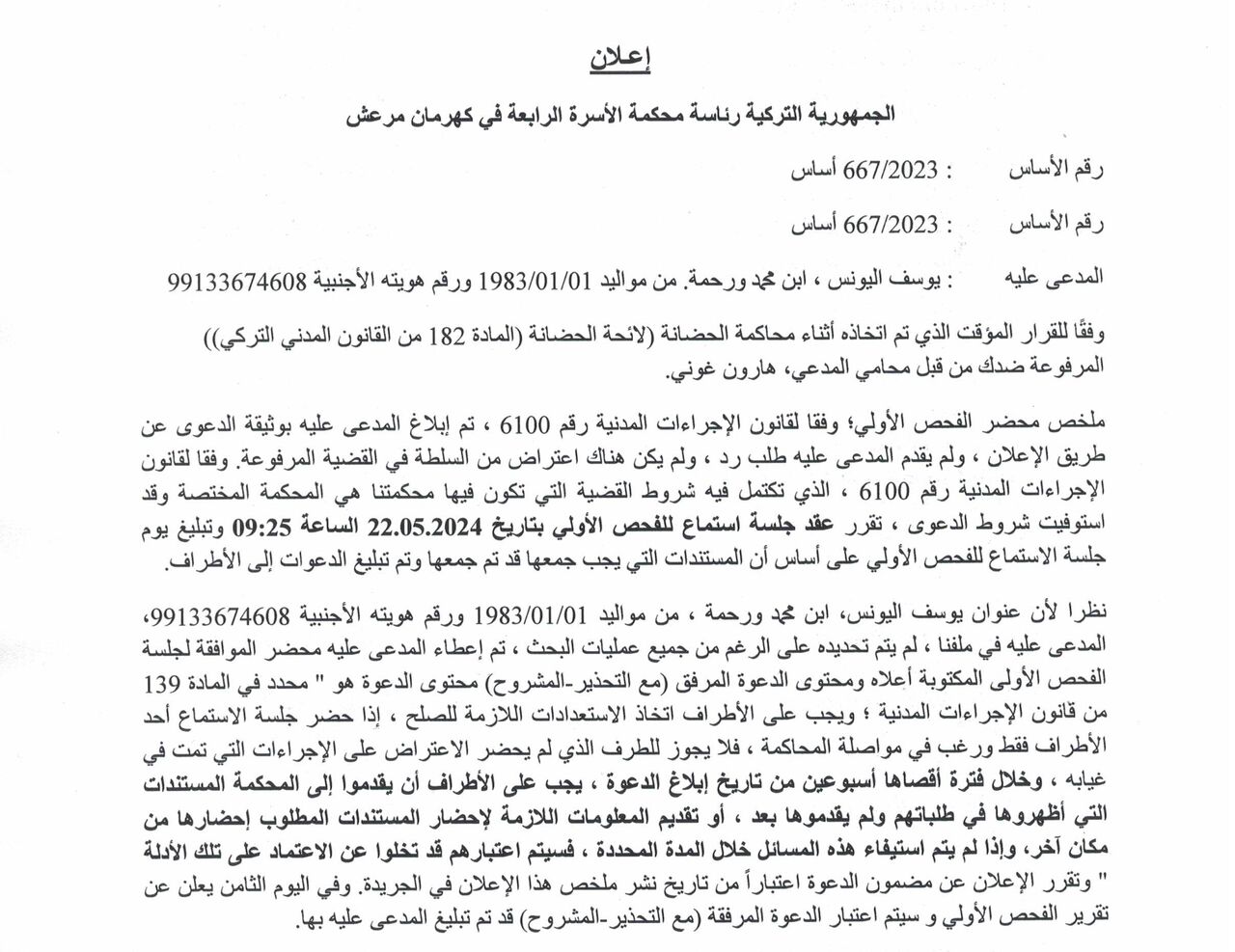 Dosyamız davalısı olan Suriye uyruklu Muhammed ve Rahma oğlu, 01/01/1983 dlu, 99133674608 yabancı kimlik nolu Yusuf Elyunus'un yapılan tüm aramalara rağmen adresinin tespit edilemediğinden davalıya yukarıda özeti yazılı ön inceleme duruşma tensip tutanağı ile ekli ihtarlı-meşruhatlı davetiye içeriği olan "HMK'nun 139.maddesinde belirtilen; tarafların sulh için gerekli hazırlığı yapmaları, duruşmaya sadece taraflardan birinin gelmesi ve yargılamaya devam etmek istemesi durumunda gelmeyen tarafın yokluğunda yapılan işlemlere itiraz edemeyeceği,-davetiyenin tebliğinden itibaren İKİ HAFTALIK KESİN SÜRE içinde tarafların dilekçelerinde gösterdikleri, ancak henüz sunmadıkları belgeleri mahkemeye sunmaları veya başka yerden getirtilecek belgelerin getirtilebilmesi amacıyla gereken açıklamayı yapmaları, bu hususların verilen süre içinde yerine getirilememesi halinde o delile dayanmaktan vazgeçmiş sayılacaklarının ihtarlarına ilişkin" hususuna ilişkin davetiye içeriğinin ilanen tebliğine karar verilmiş olup iş bu ilan özetinin gazetede yayınlandığı tarihten itibaren 8. Gün yukarıda ön inceleme tensip tutanağı ve ekli ihtarlı-meşruhatlı davetiyenin davalıya tebliğ edilmiş sayılacağı hususu ilanen tebliğ olunur.