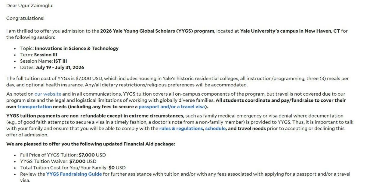 Uğur Zaimoğlu'nun kabul edildiği Yale Young Global Scholars programı, akademik mükemmelliği ve dünya çapındaki seçici kabul süreciyle biliniyor. Yale Üniversitesi’nde gerçekleşecek olan 2 haftalık bu yoğun program boyunca Zaimoğlu, Harvard ve Yale gibi Ivy League üniversitelerinin seçkin profesörlerinden ve endüstri liderlerinden eğitim alacak. Programın temel amacı, farklı kültürlerden gelen gençlerin küresel sorunlar üzerine fikir üretmesini ve liderlik becerilerini geliştirmesini sağlamak. Zaimoğlu, Türkiye'den bildiği kadarıyla sadece 3 katılımcının bulunduğu bu prestijli platformda ülkemizi temsil edecek.