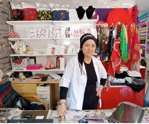 Yıllarca başka işletmelerde çalışan Sabiha Hanım, artık kendi çeyiz dükkânının sahibi. Geliri 55.000 TL’ye ulaştı.