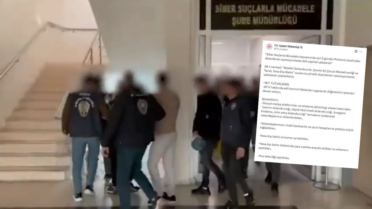 İçişleri Bakanlığı, siber suçlarla mücadele kapsamında 28 ilde eş zamanlı operasyonlar düzenlendiğini duyurdu. İçişleri Bakanlığı tarafından yapılan açıklamada, son 5 gün içinde gerçekleştirilen operasyonlarda 324 şüphelinin yakalandığı, bunlardan 181’inin tutuklandığı bildirildi. 87 şüpheli hakkında adli kontrol hükümleri uygulanırken, diğer şüphelilerin işlemlerinin sürdüğü belirtildi. Operasyonların; nitelikli dolandırıcılık, çevrim içi çocuk müstehcenliği ve tacizi ile yasa dışı bahis suçlarına yönelik olduğu kaydedildi.