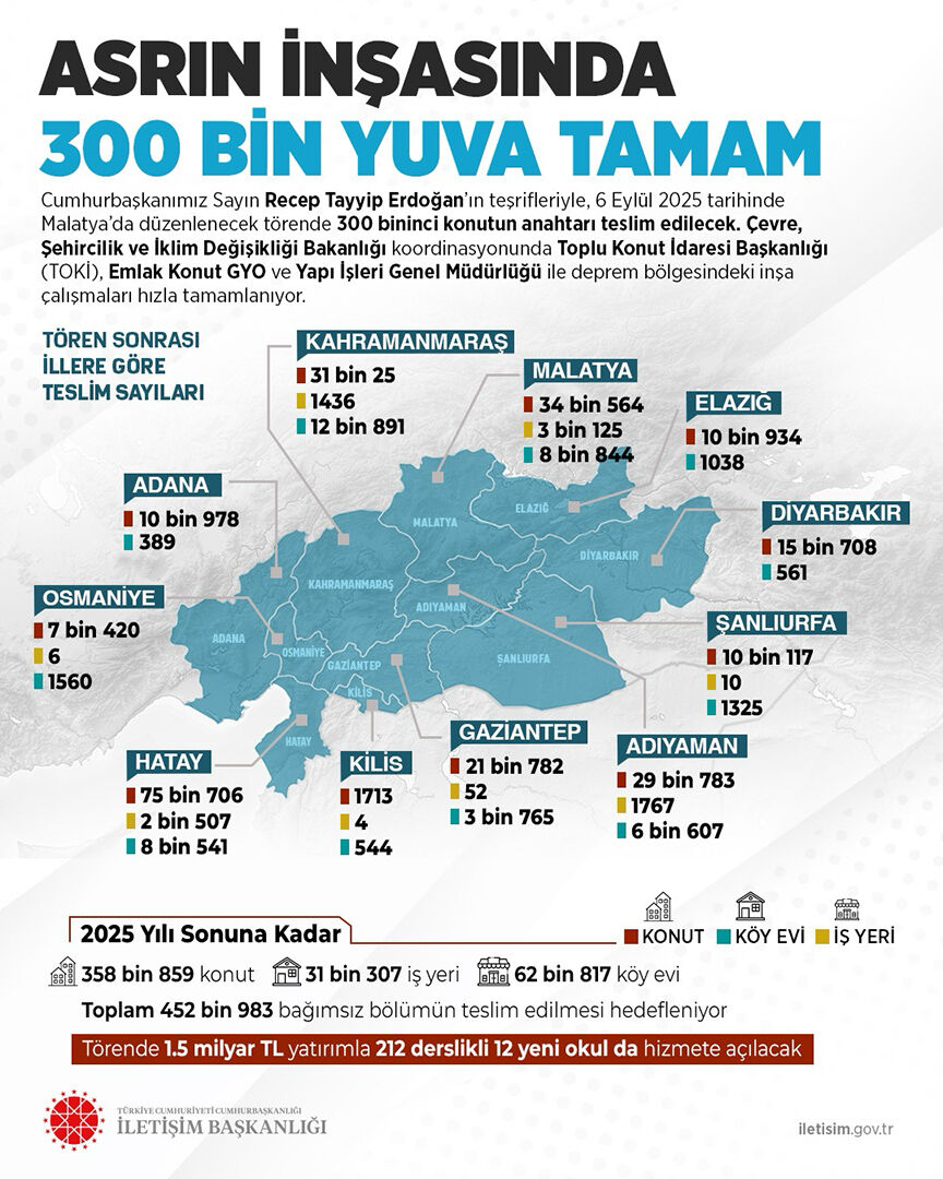 İletişim Başkanlığı’nın sosyal medya hesabından yapılan paylaşımda, Cumhurbaşkanı Recep Tayyip Erdoğan’ın katılımıyla Çevre, Şehircilik ve İklim Değişikliği Bakanlığı koordinasyonunda yapımı tamamlanan 300 bininci konutun anahtarının teslim edileceği duyuruldu. Paylaşımda, deprem bölgesinde tamamlanan ve hak sahiplerine teslim edilecek bağımsız bölümlere ilişkin bir infografik de yer aldı.