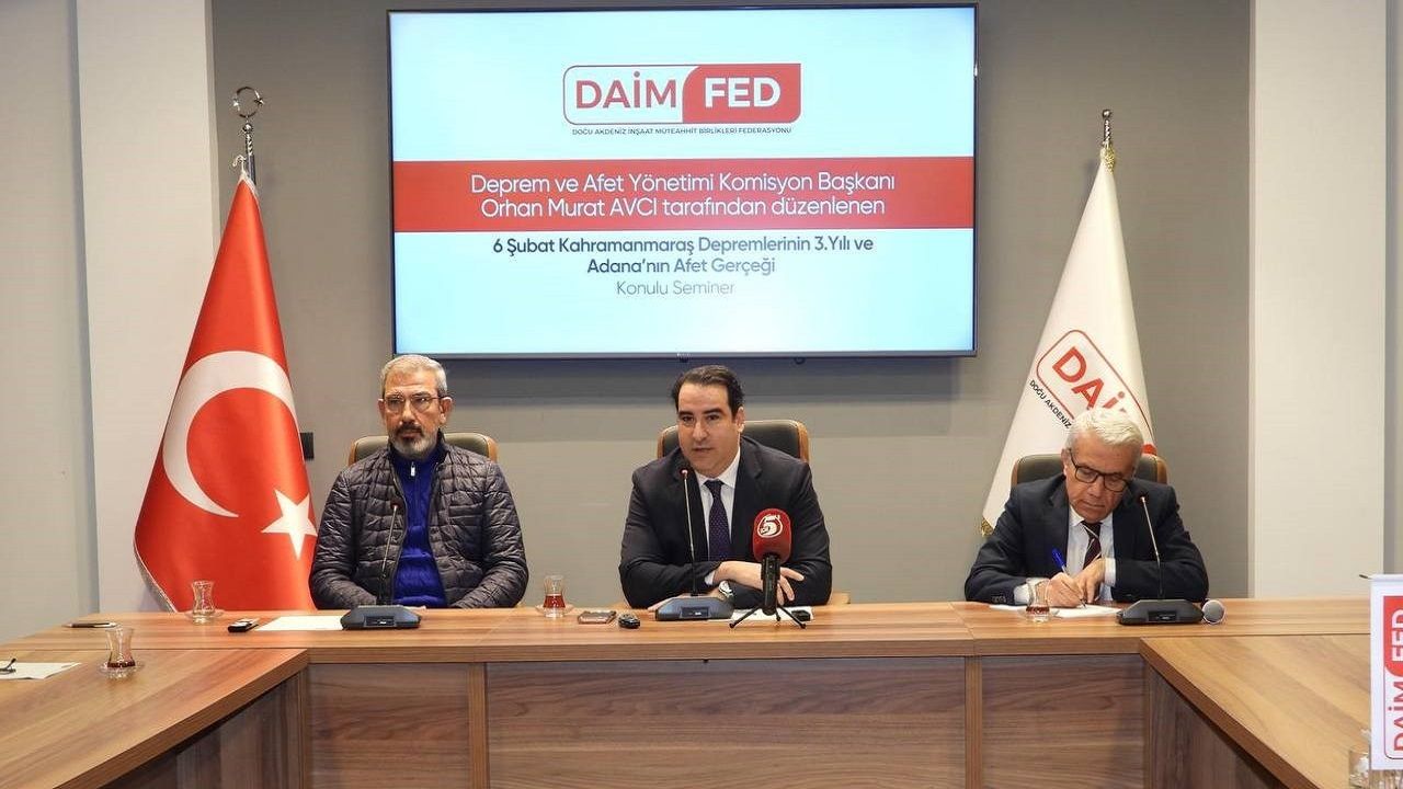 Doğu Akdeniz İnşaat Müteahhit Birlikleri Federasyonu (DAİMFED), 6 Şubat 2023’te meydana gelen Kahramanmaraş merkezli depremlerin üçüncü yıl dönümünde anlamlı bir etkinliğe imza attı. “6 Şubat Kahramanmaraş Depremlerinin 3. Yılı ve Adana’nın Afet Gerçeği” konulu seminer, DAİMFED Genel Merkezi'nde düzenlendi.