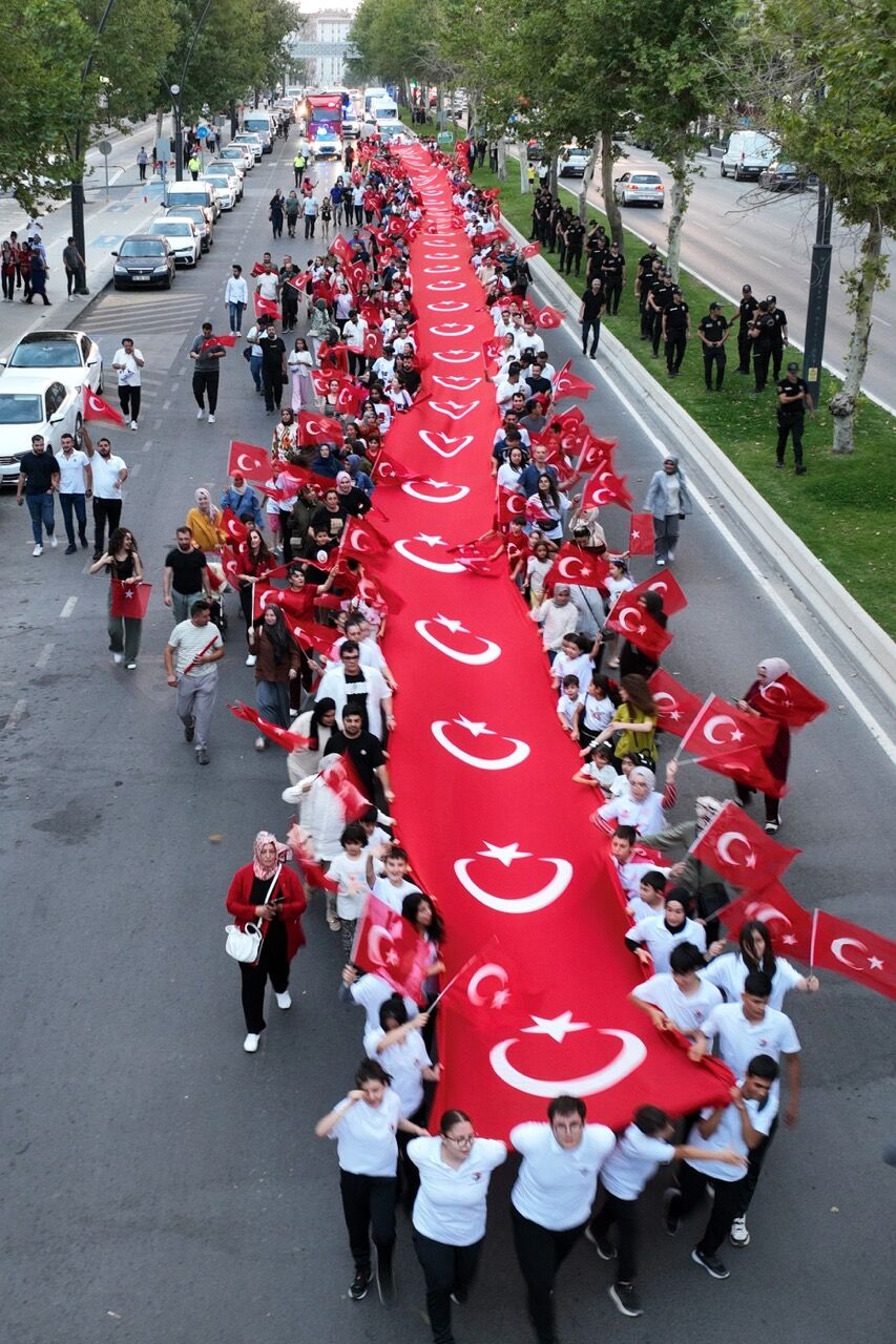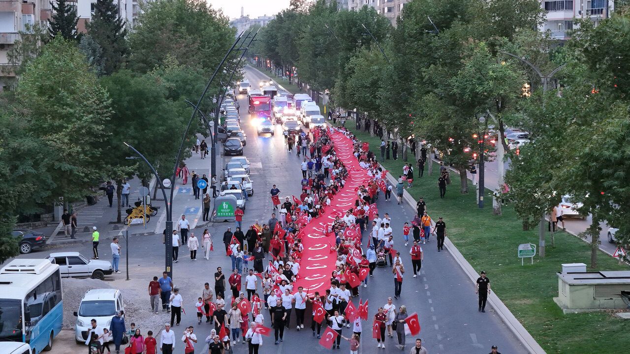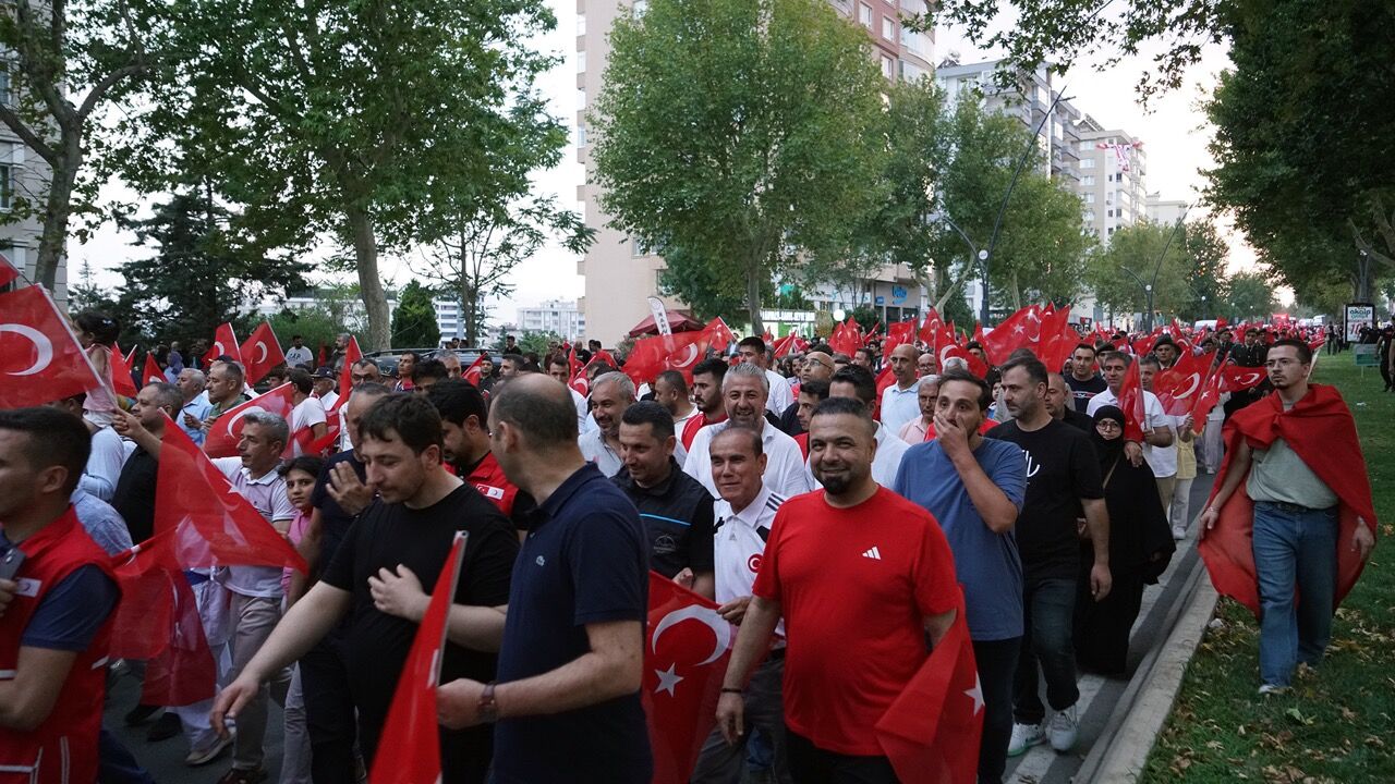 Kortej yürüyüşü boyunca açılan dev Türk Bayrağı, şehrin dört bir yanına yayılan vatan sevgisinin ve milli birlik ruhunun güçlü bir simgesi oldu. Marşlar, sloganlar ve tek yürek olan kalabalıkla birlikte şehir, o karanlık geceye karşı verdiği direnişi bir kez daha hatırlattı.