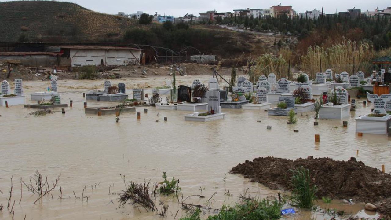 Yaşanan taşkın sonucu kanala yakın Buruk Mezarlığı'ndaki onlarca mezar sular altında kaldı.