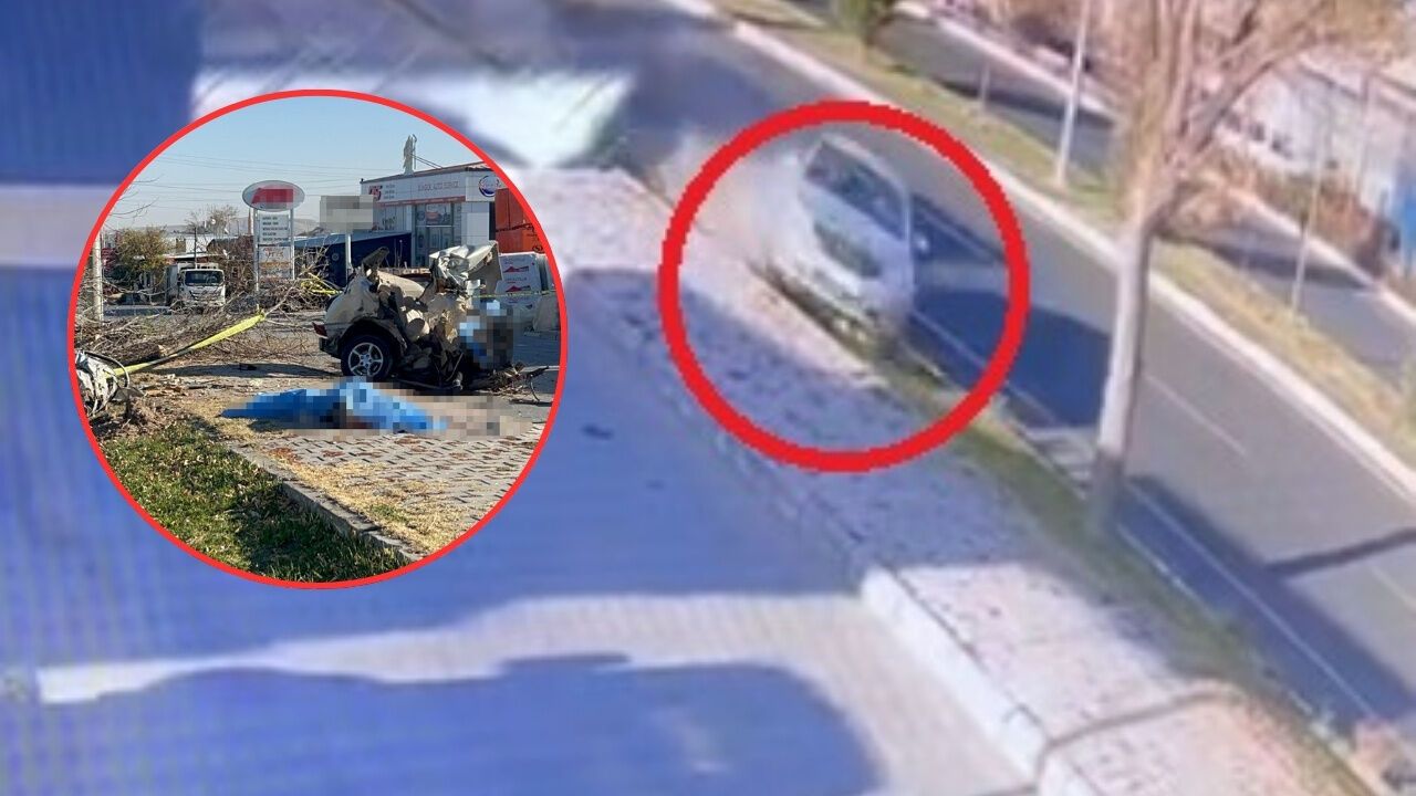 Kaza anı, çevredeki bir iş yerinin güvenlik kamerasına yansıdı. Görüntülerde, hızla gelen otomobilin refüje çıkarak ağaca çarptığı ve çarpmanın şiddetiyle ikiye bölündüğü açıkça görülüyor.