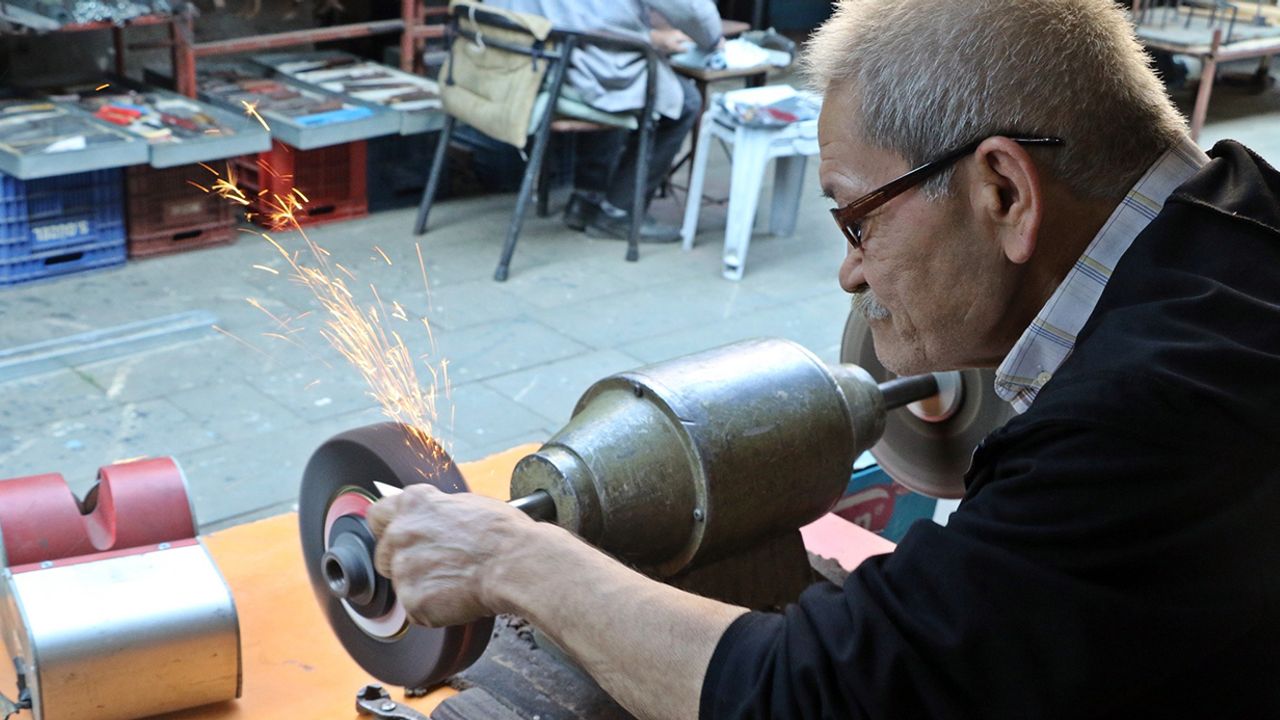 Muratpaşa ilçesi Demirciler Çarşısı’nda bıçak bileme ve satış işini yapan Mehmet Şakar (65), mesleğini 7’nci kuşak olarak ailesinden devralarak sürdürüyor. 15 yaşında babasının yanında mesleğe adım atan Mehmet Şakar, 50 yıldır sabahın erken saatlerinde açtığı iş yerinde bıçak bileme ve satış işi yapıyor.