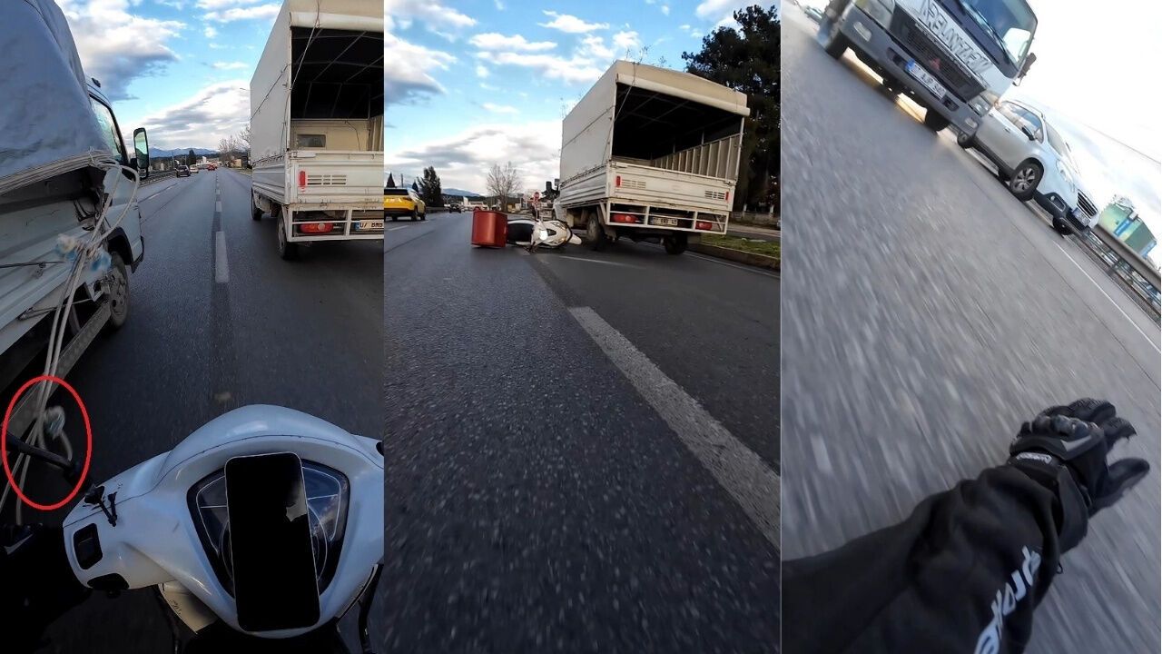 Kask kamerasına yansıyan görüntüler, yaşanan tehlikeyi gözler önüne serdi. Görüntülerde motosikletlinin yere düştüğü sırada yanındaki kamyonetin ilerlemeye devam ettiği görüldü. Sürücü, kamyonetin arka tekerleklerinin hemen yanında sürüklenerek büyük bir tehlike atlattı.
