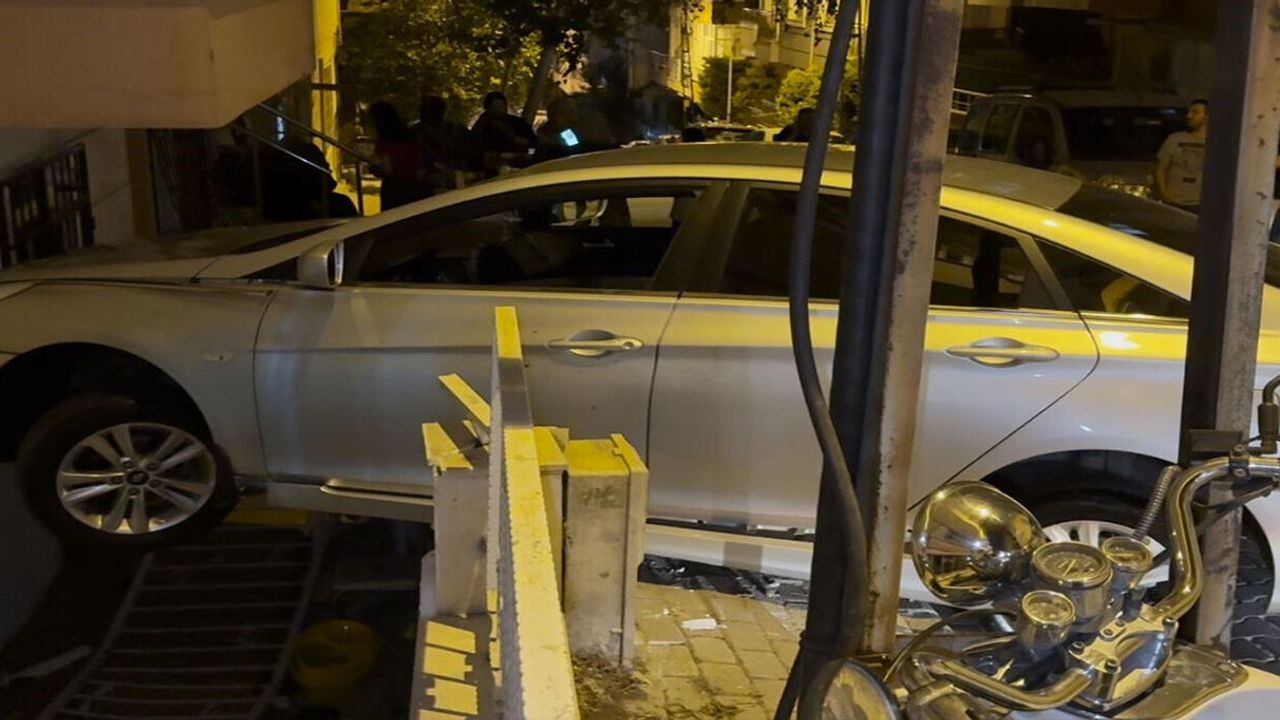 Kontrolden çıkan araç, hızla bahçe koruma demirlerini yıktıktan sonra apartman girişine çarptı.