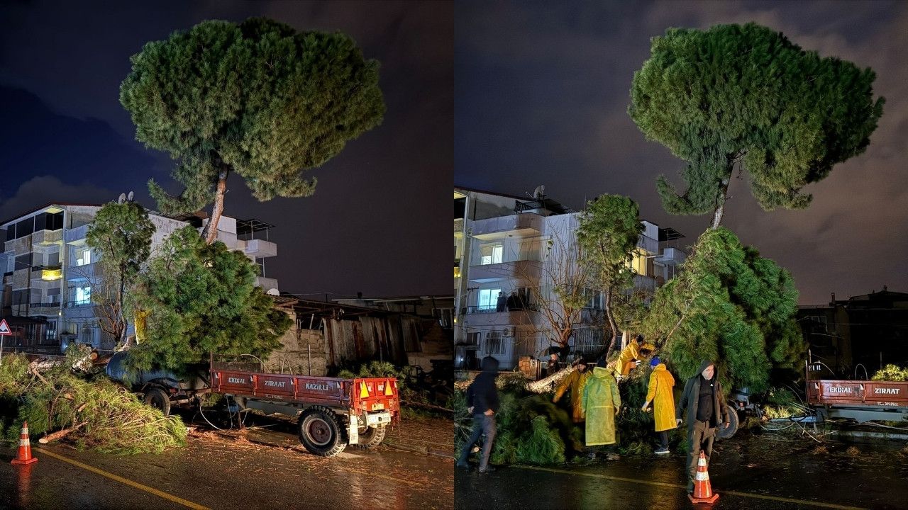 Aydın’ın Nazilli ilçesinde akşam saatlerinde etkisini artıran şiddetli fırtına, Şirinevler Mahallesi Beşeylül Caddesi'nde bir çam ağacının devrilmesine neden oldu.