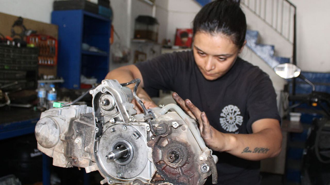 Türkiye’de sanayi sektöründe yaşanan çırak sorunu birçok kadını da meslek sahibi yapmaya devam ediyor. Aydın’ın Efeler ilçesinde çırak bulamayan eşine destek olmak amacıyla sanayiye gelen 2 çocuk annesi 33 yaşındaki Hayriye Gedik de bu kadınlardan biri olurken, kısa sürede işi öğrenerek motor tamir etmeye başladı. Bir yandan eşinin çırağı olarak motor tamirini öğrenen ve evde annelik, sanayide ustalık yapan Hayriye Gedik, azmiyle dikkat çekiyor. Tamire getirilen motosikletlerin arıza tespitini ve tamirini yapan Hayriye Usta, istedikten sonra kadının başaramayacağı hiçbir şey olmadığını söyledi.