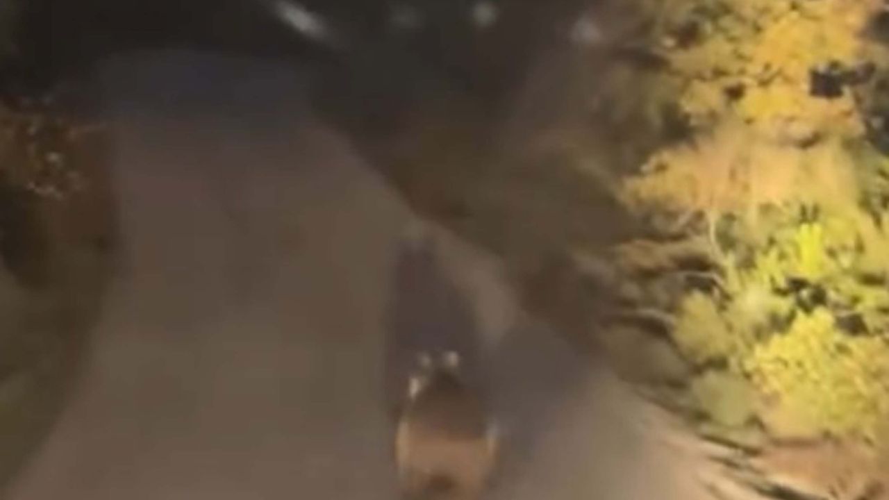 Çanakkale’nin Biga ilçesinde Elmalı köyü yolunda seyir halindeki bir sürücü, köy yoluna inen bir ayıyı cep telefonu ile kaydetti.