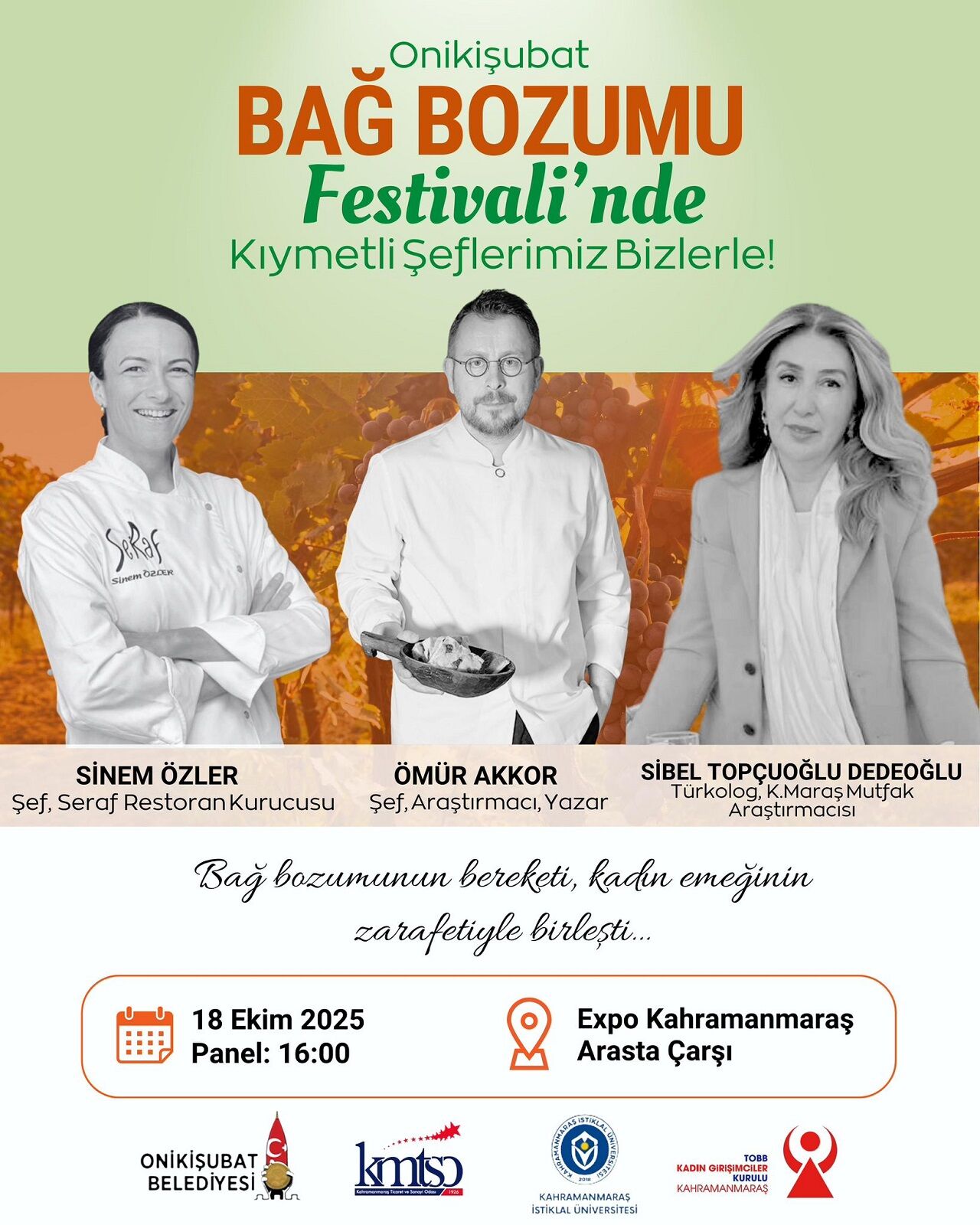 Kahramanmaraş’ın Onikişubat ilçesi, 18-19 Ekim 2025 tarihlerinde unutulmaz bir gastronomi deneyimine ev sahipliği yapacak. Onikişubat Belediyesi öncülüğünde, Kahramanmaraş Ticaret ve Sanayi Odası, İstiklal Üniversitesi ve TOBB Kadın Girişimciler Kurulu işbirliğiyle düzenlenen Geleneksel Bağ Bozumu Festivali, bu yıl da hem üreticiye hem de yerel lezzetlere ışık tutacak. Ünlü şefler Ömür Akkor ve Sinem Özler’in katılımıyla gerçekleşecek festival, EXPO 2023 Arasta Çarşısı’nda gerçekleşecek renkli etkinliklerle dolu iki gün vaat ediyor.