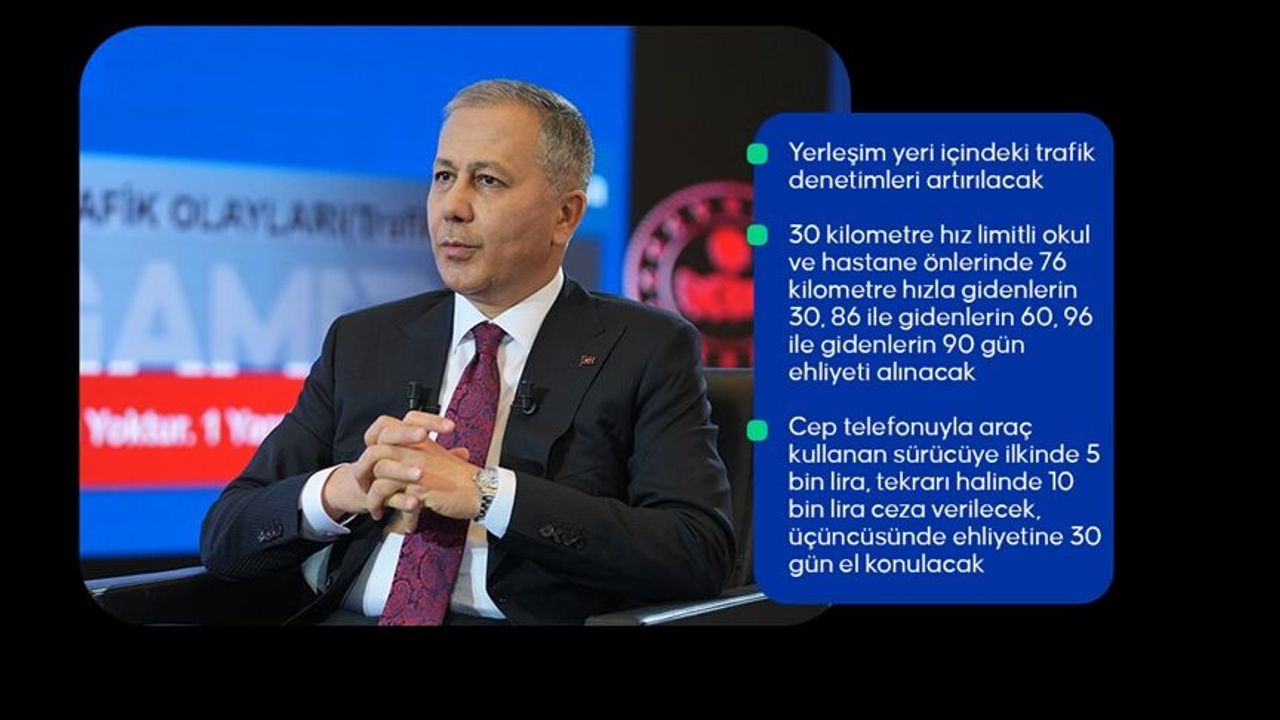İçişleri Bakanı Yerlikaya, yerleşim yeri içindeki trafik denetimlerini artıracaklarını bildirerek, "Trafikte can kaybı ve yaralanmanın en büyük müsebbibi hız kuralı ihlali. Barem sistemi getirdik. Yerleşim yeri içi ve yerleşim dışı ayrımı yaptık." dedi.