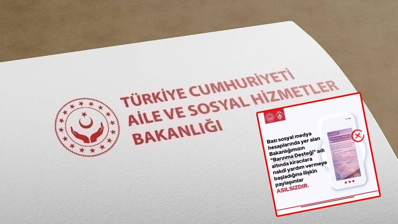 "Bazı sosyal medya hesaplarında yer alan Bakanlığımızın 'barınma desteği' adı altında kiracılara nakdi yardım vermeye başladığına ilişkin paylaşımlar asılsızdır. Vatandaşlarımızın kişisel verilerini ele geçirmek amacıyla bu tür paylaşımlarda bulunan kişiler hakkında gerekli hukuki girişimlerde bulunuyoruz. Vatandaşlarımız, sosyal hizmetlerimiz ve sosyal yardımlarımız hakkındaki güncel ve doğru bilgilere resmi internet sitemiz ve sosyal medya hesaplarımız aracılığıyla ulaşabilir."