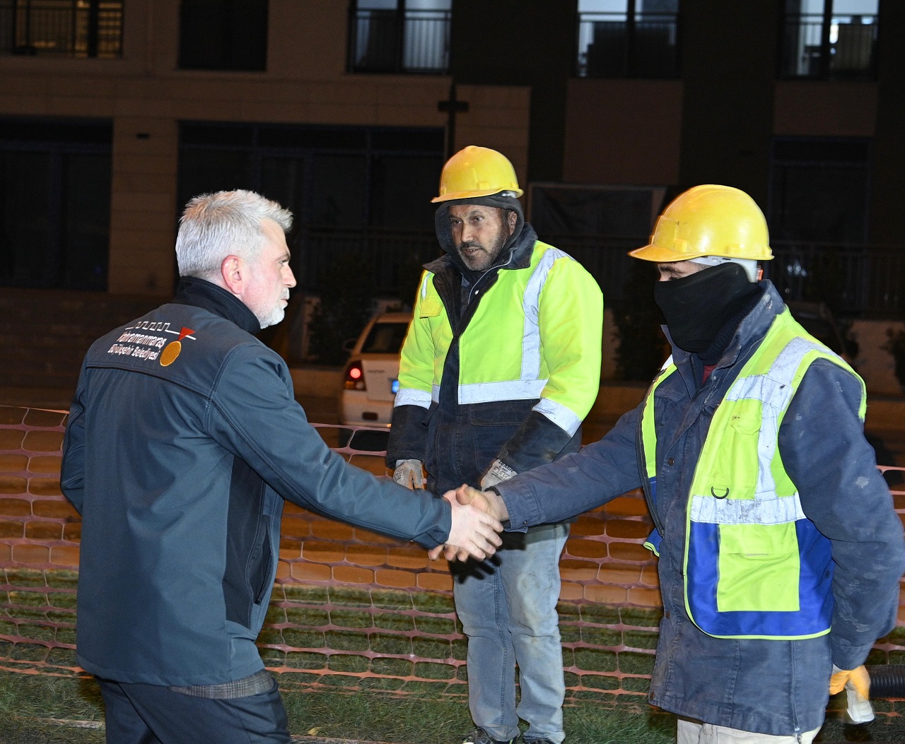 İncelemeler sırasında sahada görev yapan belediye personeliyle de bir araya gelen Başkan Görgel, özverili çalışmaları için ekiplere teşekkür ederek kolaylıklar diledi.