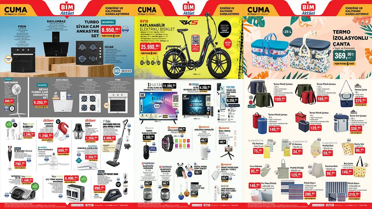 Milyonlarca vatandaşın merakla beklediği BİM 16 Mayıs 2025 aktüel ürünler kataloğu nihayet yayınlandı. Cuma gününe özel indirimlerle dolu katalogda, mutfaktan pikniğe, ev eşyasından elektroniğe kadar pek çok farklı kategoride dikkat çekici ürünler yer alıyor. Özellikle siyah cam ankastre set ve katlanabilir elektrikli bisiklet, şimdiden alışveriş listelerinin zirvesine yerleşti.