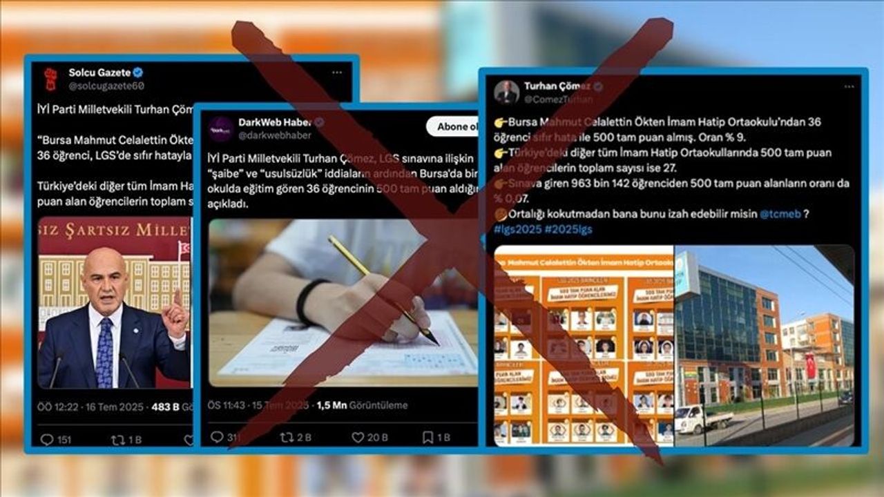 İYİ Parti Balıkesir Milletvekili Turhan Çömez, sosyal medya platformu X üzerinden yaptığı paylaşımda, Bursa Mahmut Celalettin Ökten İmam Hatip Ortaokulu'ndan 36 öğrencinin Liselere Geçiş Sistemi (LGS) sınavında sıfır hatayla 500 tam puan aldığını ileri sürdü. Çömez, paylaşımının devamında, Türkiye genelindeki diğer tüm İmam Hatip Ortaokullarında 500 tam puan alan öğrenci sayısının ise toplamda 27 olduğunu iddia etti.