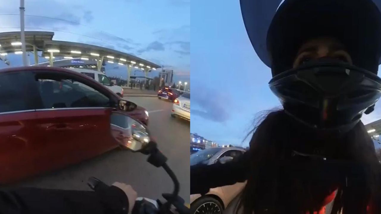 Olay anını anlatan motosiklet sürücüsü Rabia Bozkurt, "Trafikte seyir halindeyken orta şeritte seyrediyordum. Arkamda bir aracın beni sıkıştırdığını fark ettim. Motosikletin boyutu nedeniyle küçük olduğu için araç gibi şeritte yer kaplamıyor. Arkamda bulunan kadın da beni sıkıştırdı. Ben sağa çekildikçe o üzerime doğru geldi. Daha sonra inatlaşınca bana çarptı ve bende dengemi kaybettim. Zor olsada denge mi toparladım ve motosikletten inerek tepki gösterdim. Bu tür olayların yaşanmaması lazım" dedi.