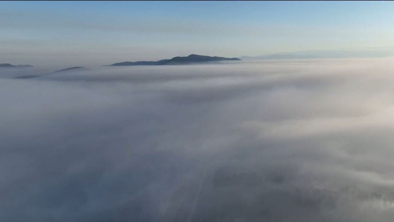 Ancak rüzgarın olmaması nedeniyle yükselen dumanın bölgede adeta sis tabakası oluşturduğu görüldü. Yangın sonrası geriye kalan duman bulutları, dron ile havadan görüntülendi.
