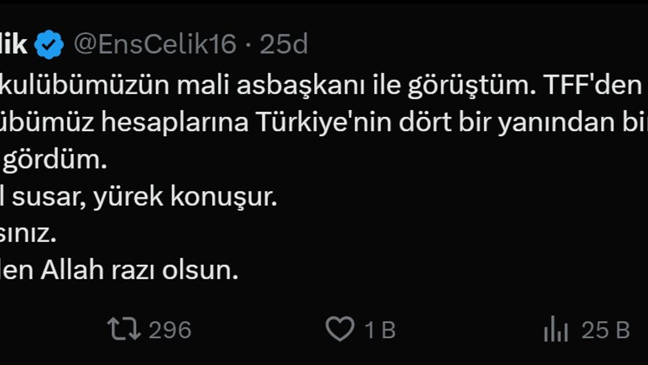 PFDK cezasının ardından sosyal medya hesabından açıklama yapan Bursaspor Başkanı Enes Çelik, kulübe ülke genelinden destek yağdığını belirtti. Çelik, “Az önce kulübümüzün mali asbaşkanı ile görüştüm. TFF’den gelen ceza sonrası, kulüp hesaplarımıza Türkiye’nin dört bir yanından binlerce bağış geldiğini gördüm. Bazen dil susar, yürek konuşur. İyi ki varsınız. Hepinizden Allah razı olsun” ifadelerini kullandı.