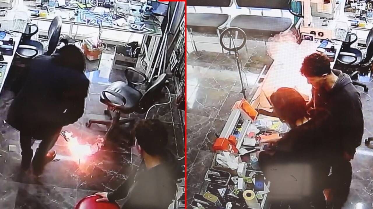 Bir başka telefondaki işlemin bitmesi için yanındaki genç çalışanı ile telefonla ilgilenen Turan, telefonun adeta bomba gibi patlamasıyla neye uğradığını şaşırdı. Tezgahta duran telefon bir anda patlayarak alev aldı. Turan, alev alev yanan telefonu tezgahtan aşağıya iterek ayaklarıyla söndürdü. Yaşanan tüm bu anlar anbean iş yerinin güvenlik kamerasına yansıdı.