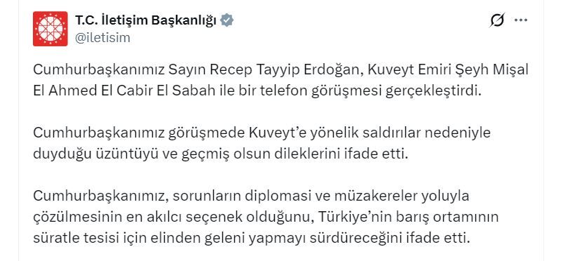 İletişim Başkanlığı’nın sosyal medya hesabından yapılan açıklamada, Cumhurbaşkanı Erdoğan’ın Kuveyt’e yönelik saldırılar nedeniyle üzüntüsünü ifade ettiği belirtildi. Erdoğan, Kuveyt Emiri El Sabah’a geçmiş olsun dileklerini iletti.