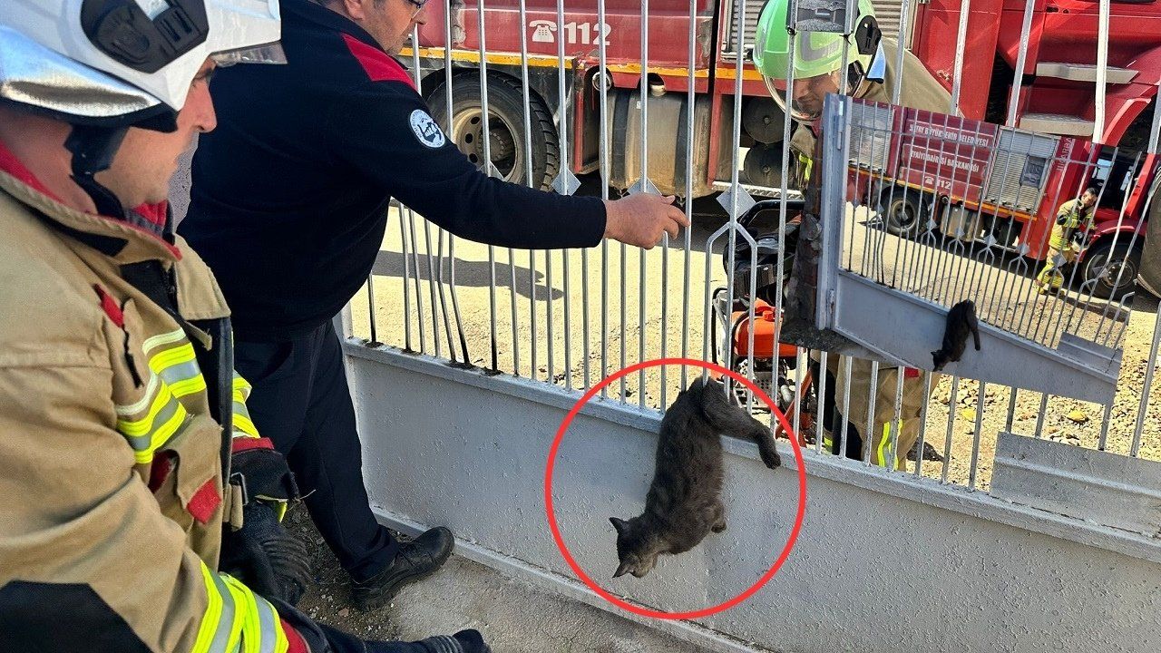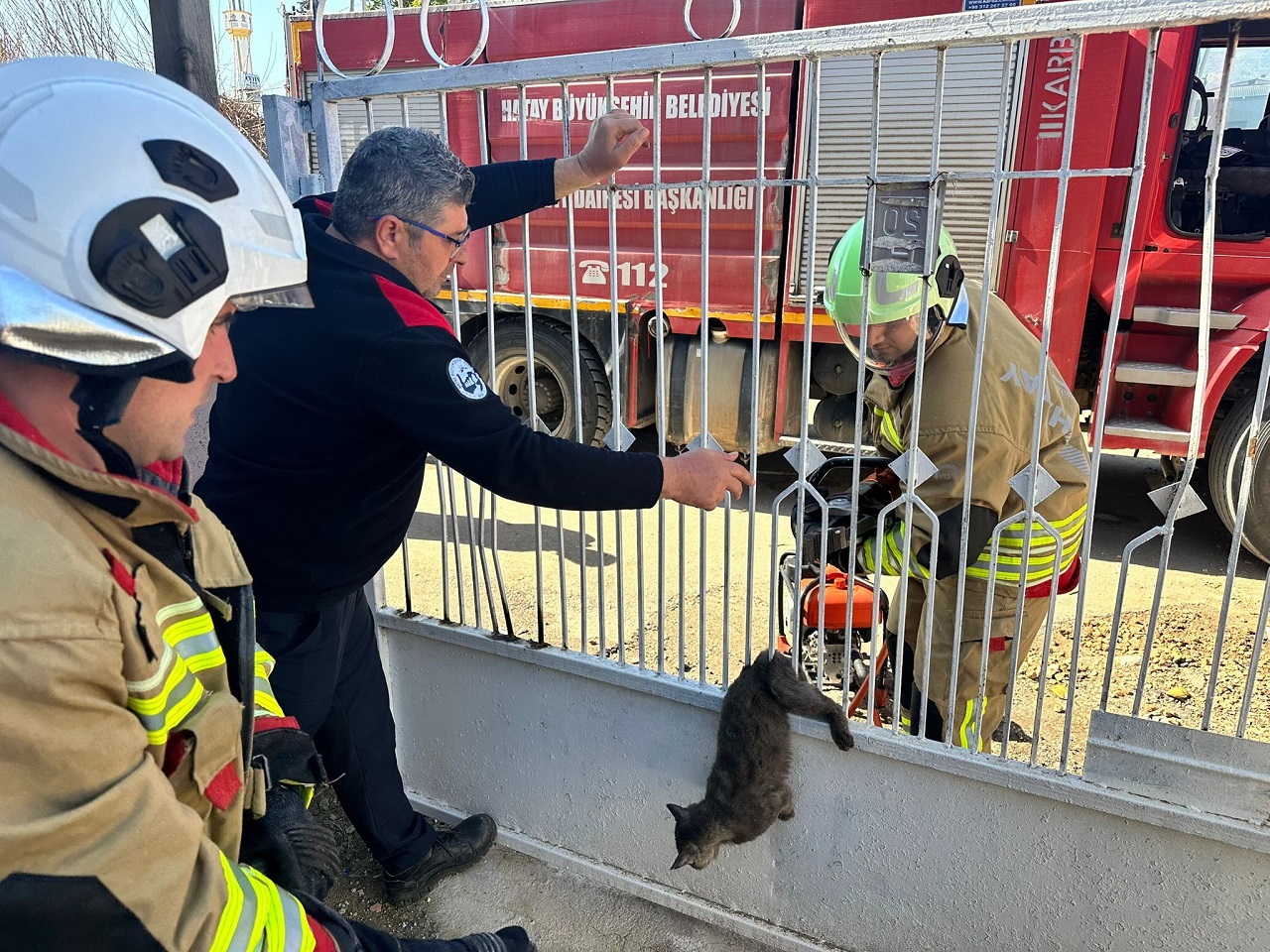 Hatay Büyükşehir Belediyesi itfaiye ekipleri, kısa sürede olay yerine ulaştı. Ekipler, kedinin zarar görmemesi için kontrollü ve hassas bir çalışma yürüttü. Demir korkuluk arasına sıkışan kedi, ekiplerin titiz müdahalesi sonucu kurtarıldı.