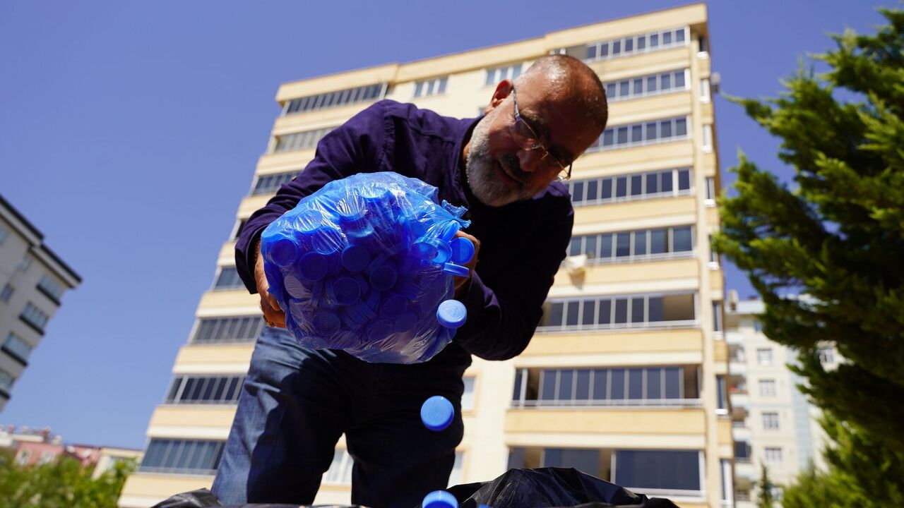 Gülmez, depremzedeler için kurulan çadır ve konteyner kentlerde mavi kapakların çöpe atılmayıp toplanmasını sağladı.