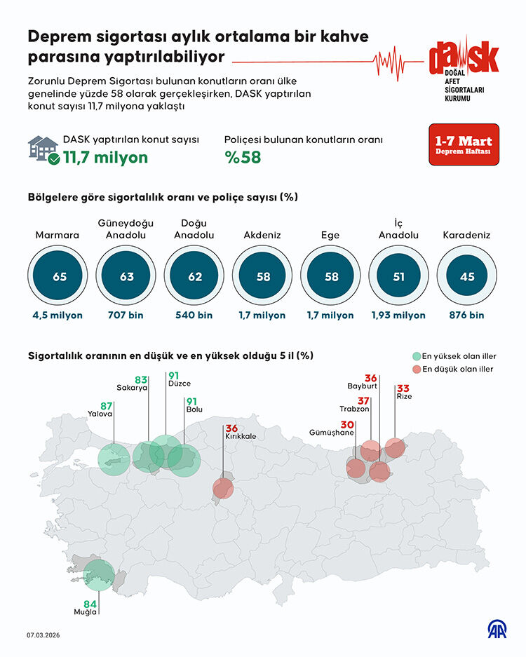 DASK verilerine göre Türkiye genelinde zorunlu deprem sigortası bulunan konut oranı yüzde 58 seviyesinde bulunuyor.