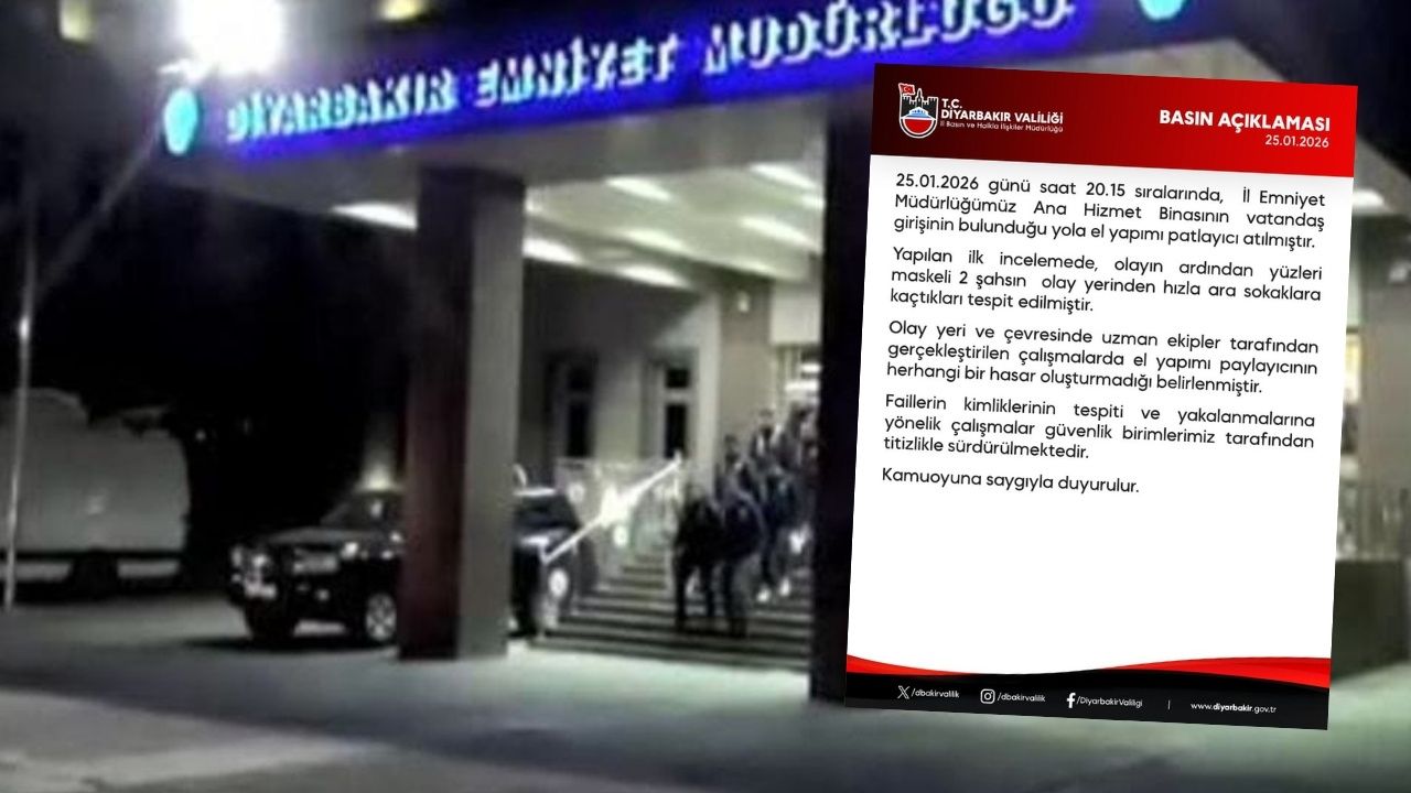 Olayla ilgili Diyarbakır Valiliği tarafından yapılan açıklamada, patlayıcının hasara neden olmadığı vurgulandı. Açıklamada, “25.01.2026 günü saat 20.15 sıralarında İl Emniyet Müdürlüğümüz Ana Hizmet Binası’nın vatandaş girişinin bulunduğu yola el yapımı patlayıcı atılmıştır. Yapılan ilk incelemelerde herhangi bir hasar tespit edilmemiştir. Olayın faillerinin yakalanmasına yönelik çalışmalar titizlikle sürdürülmektedir” ifadelerine yer verildi.