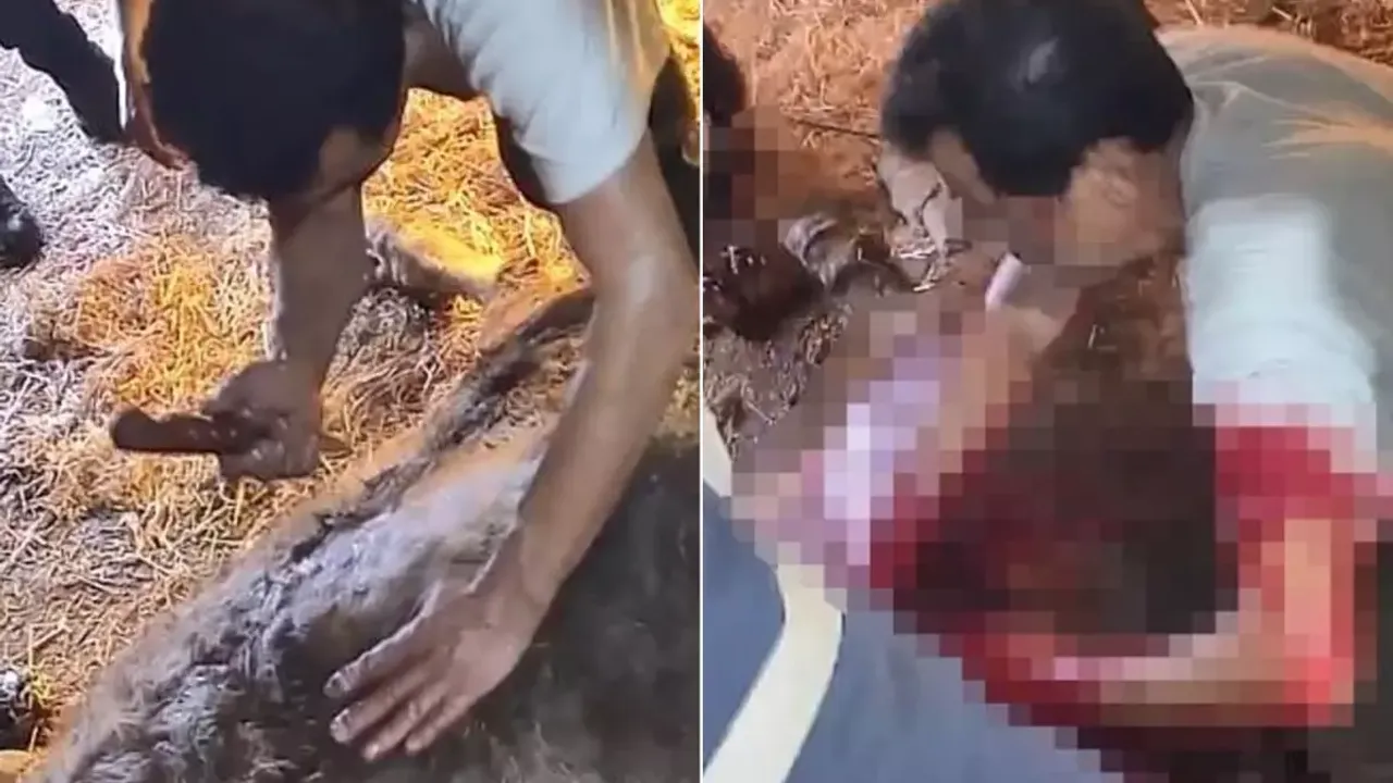 Aydın’ın Karpuzlu ilçesinde doğum yapmakta zorlanan bir inek, veteriner bulunamayınca ekmek bıçağı ile ameliyat edilmeye çalışıldı. Talihsiz hayvan, anestezisiz ve tehlikeli yöntemlerle yapılan müdahale sonrası telef oldu. O anlar güvenlik kameralarına yansıdı ve izleyenleri şoke etti.