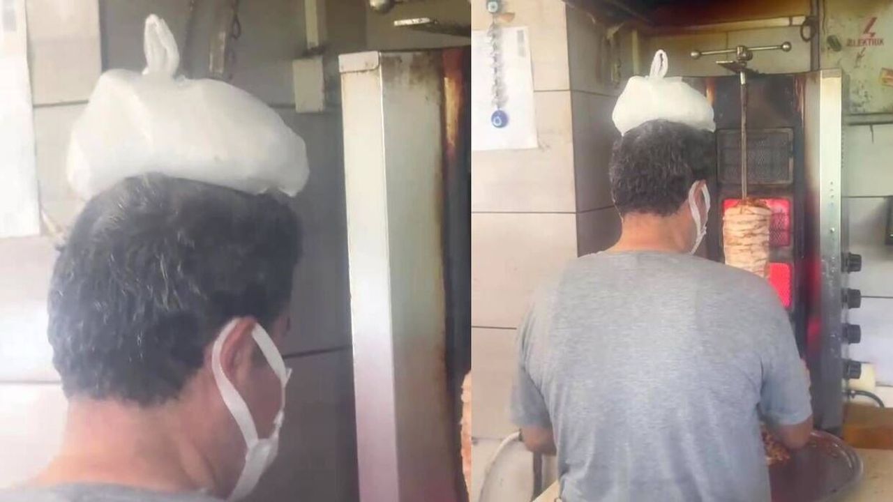 İskenderun ilçesinde ateş karşısında çalışan bir dönerci ustası, kafasına buz torbası koyarak serinlemeye çalıştı. Gülümseten görüntü ortaya çıkarken o anlar müşteri tarafından kaydedildi.