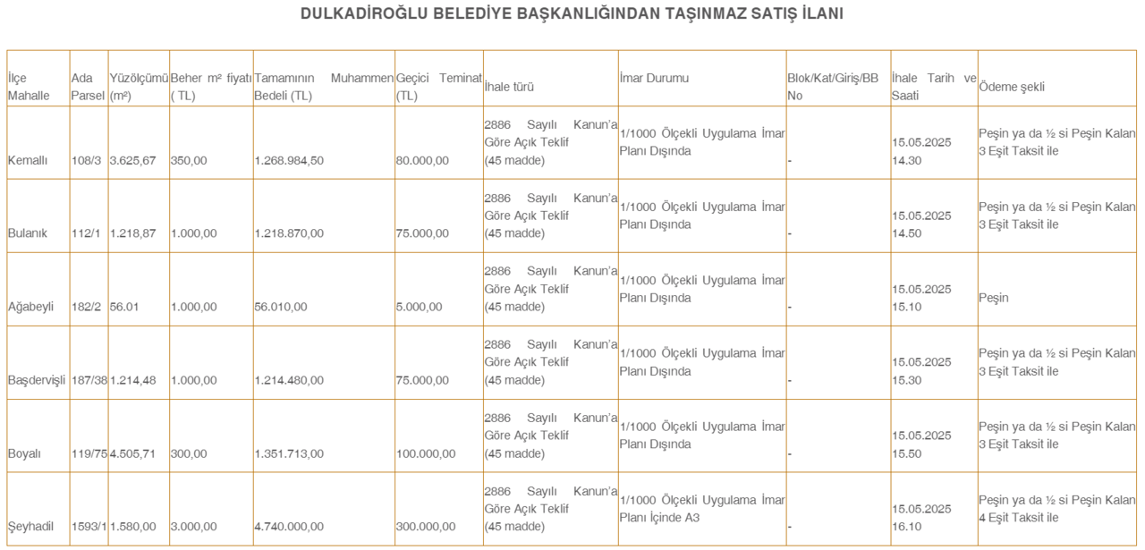 Dulkadiroğlu Belediyesi’nin satışa çıkardığı taşınmazlar; Kemallı, Bulanık, Ağabeyli, Başdervişli, Boyalı ve Şeyhadil mahallelerinde yer alıyor. İmar durumları, büyük çoğunluğu için "1/1000 Ölçekli Uygulama İmar Planı Dışında" olarak belirtilirken, sadece Şeyhadil Mahallesi’ndeki taşınmaz "A3" yapılaşma koşulu ile imar planı içinde bulunuyor.