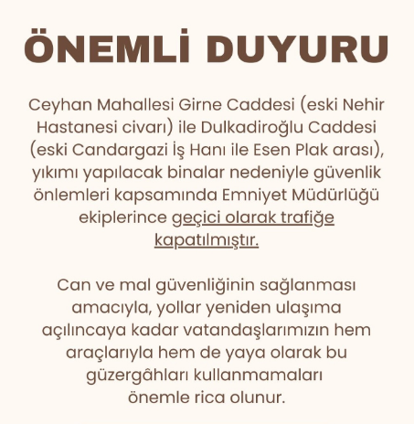 Başkan Gürbüz, Girne Caddesi (eski Nehir Hastanesi civarı) ile Dulkadiroğlu Caddesi (eski Candargazi İş Hanı ile Esen Plak arası) arasında kalan bölgenin Emniyet Müdürlüğü ekiplerince geçici olarak trafiğe kapatıldığını söyledi.