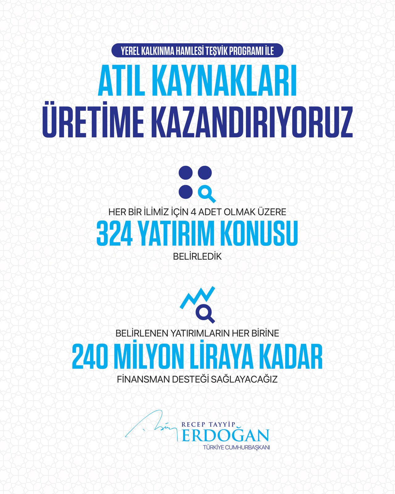 Cumhurbaşkanı Erdoğan, sosyal medya hesabından yaptığı paylaşımda, “Yerel Kalkınma Hamlesi Teşvik Programı ile atıl kaynakları üretime kazandırmayı ve bölgesel rekabetçiliği artırmayı hedefliyoruz. Belirlenen yatırımların her birine 240 milyon liraya kadar finansman desteği sağlayacağız. İş dünyamız için hayırlı olmasını diliyorum.” ifadelerini kullandı.