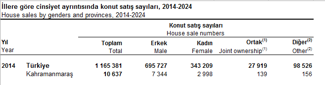 Kahramanmaraş’ta 2014 yılında toplam 10.637 konut satışı gerçekleşti. Erkekler 7.344 adet ile satışların yaklaşık %69’unu oluştururken, kadın alıcılar 2.998 konut ile üçte bir seviyesinde kaldı. Ortak mülkiyet 139 adet, diğer satış türleri ise 156 adet olarak kaydedildi.