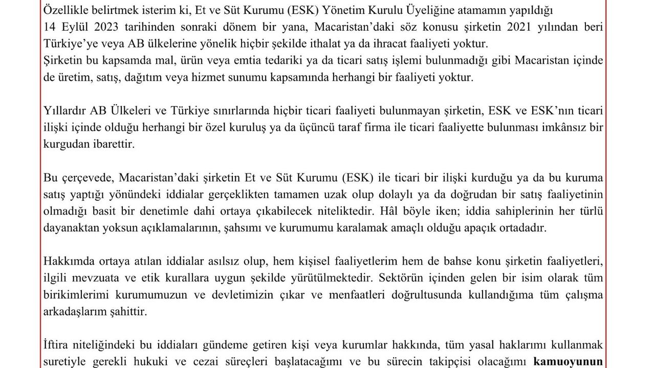 ESK Genel Müdürü ve Yönetim Kurulu Başkanı Mücahid Taylan da konuyla ilgili açıklamalarda bulundu. Taylan, bazı basın-yayın organlarında kendisi ve Macaristan merkezli bir şirket hakkında gerçeği yansıtmayan iddiaların yer aldığını ifade etti. Taylan, “14 Eylül 2023 tarihindeki atamamdan sonraki dönemde, Macaristan’daki şirketin Türkiye veya AB ülkelerine yönelik hiçbir ticari faaliyeti bulunmamaktadır. Bu şirketin ESK ile herhangi bir ticari ilişkisi yoktur” dedi.