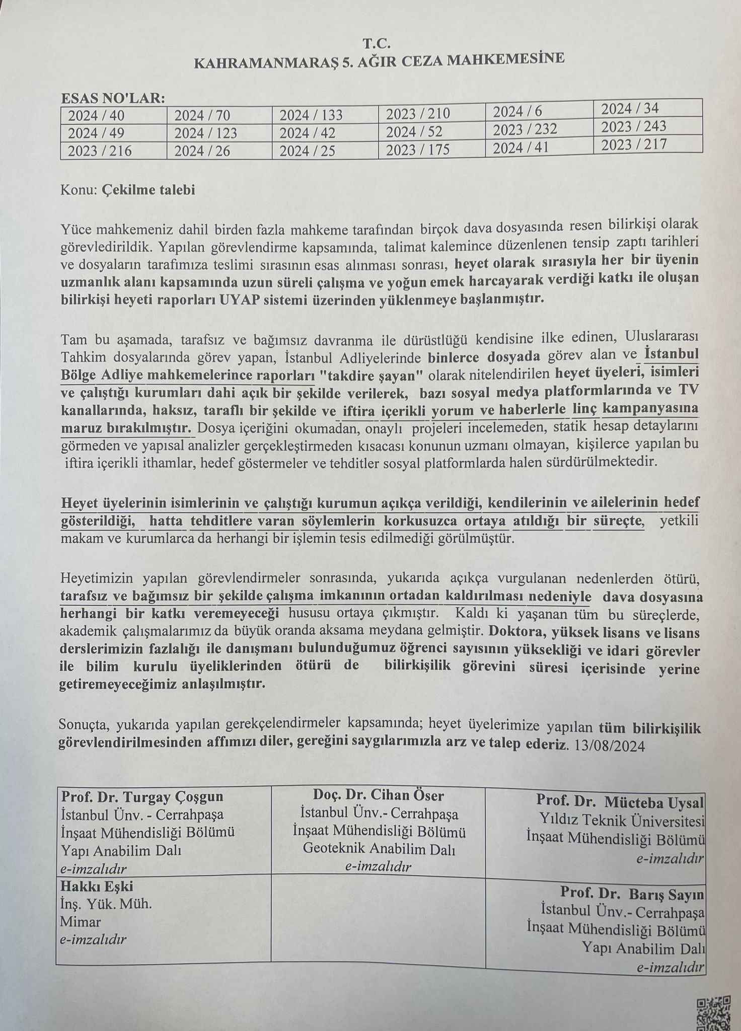 6 Şubat 2023 depremlerinde yıkılan ve 35 kişinin yaşamını yitirdiği Kahramanmaraş’taki Ezgi Apartmanı davasında tartışma yaratacak yeni bir iddia ortaya atıldı. Geçtiğimiz günlerde yeni bilirkişi heyetinin dosyadan çekildiği açıklanırken, şimdi de daha önce aynı dosyada görev yapan bilirkişilerin tehdit edildikleri öne sürüldü. Bu iddiaya göre, bilirkişi heyeti pastanenin sahiplerini kusursuz bulan raporun ardından hem fiziki hem de dijital tehditlere maruz kaldı ve bu nedenle sadece bu davadan değil, tüm deprem dosyalarından çekilme kararı aldı.