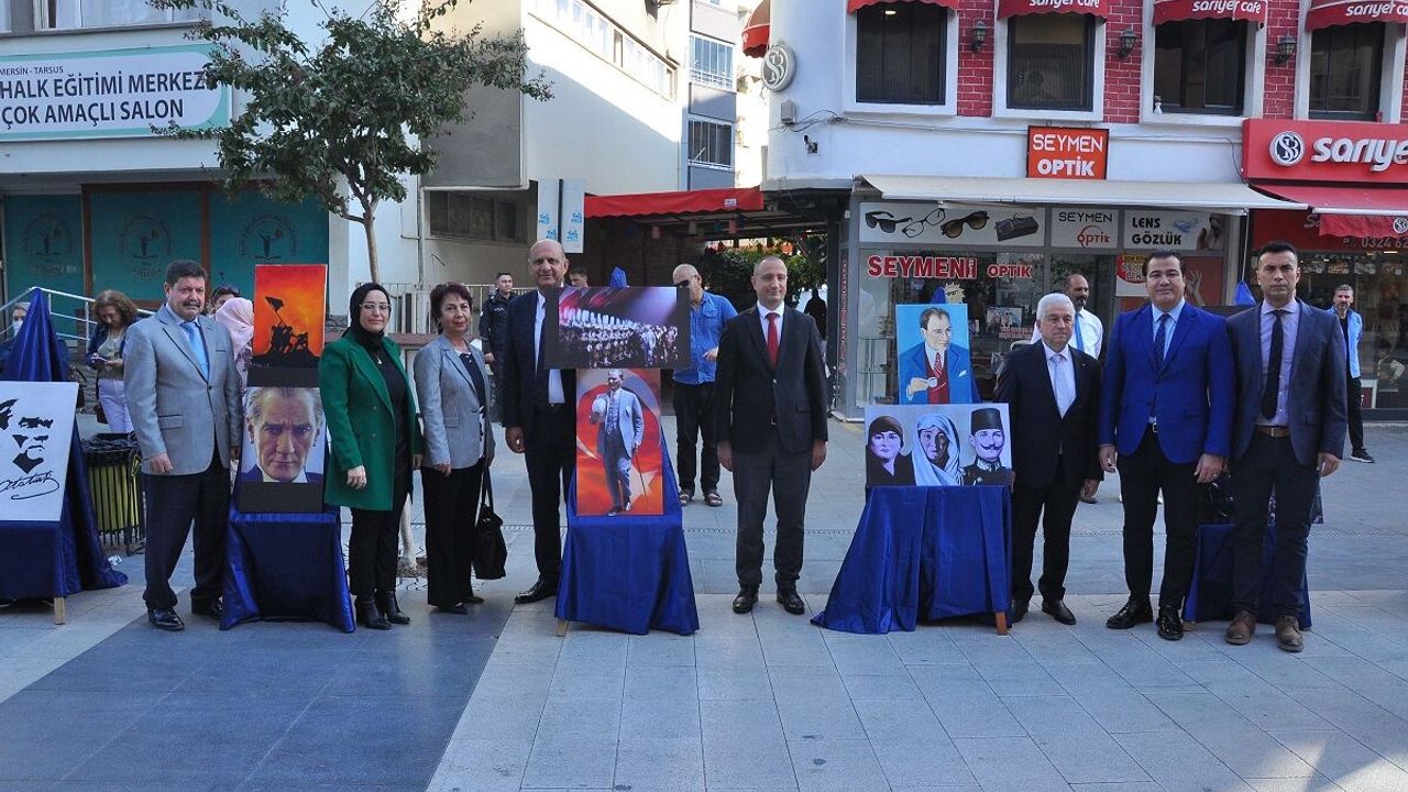 Tarsus Halk Eğitim Merkezi tarafından Yarenlik Alanı'nda düzenlenen sergide, öğretmen ve öğrenciler tarafından yapılan Atatürk temalı resimlerle Atatürk fotoğrafları yer aldı.