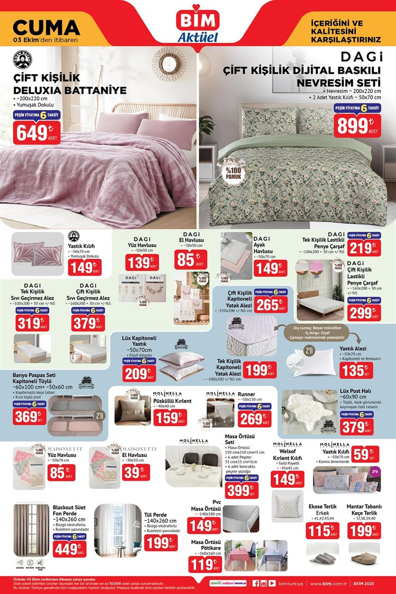 BİM’in yeni kampanyası 3 Ekim 2025 Cuma günü itibarıyla tüm mağazalarda geçerli olacak. Katalogdaki ürünler, stoklarla sınırlı olarak satışa sunulacak. Ev tekstili ve mutfak ürünlerinde indirim fırsatını kaçırmak istemeyen tüketiciler, BİM mağazalarına erkenden uğramayı planlıyor.