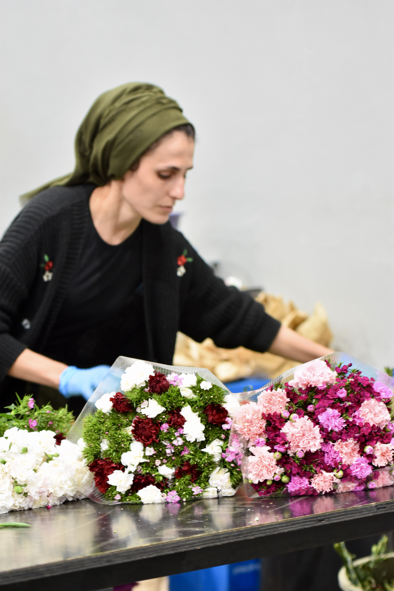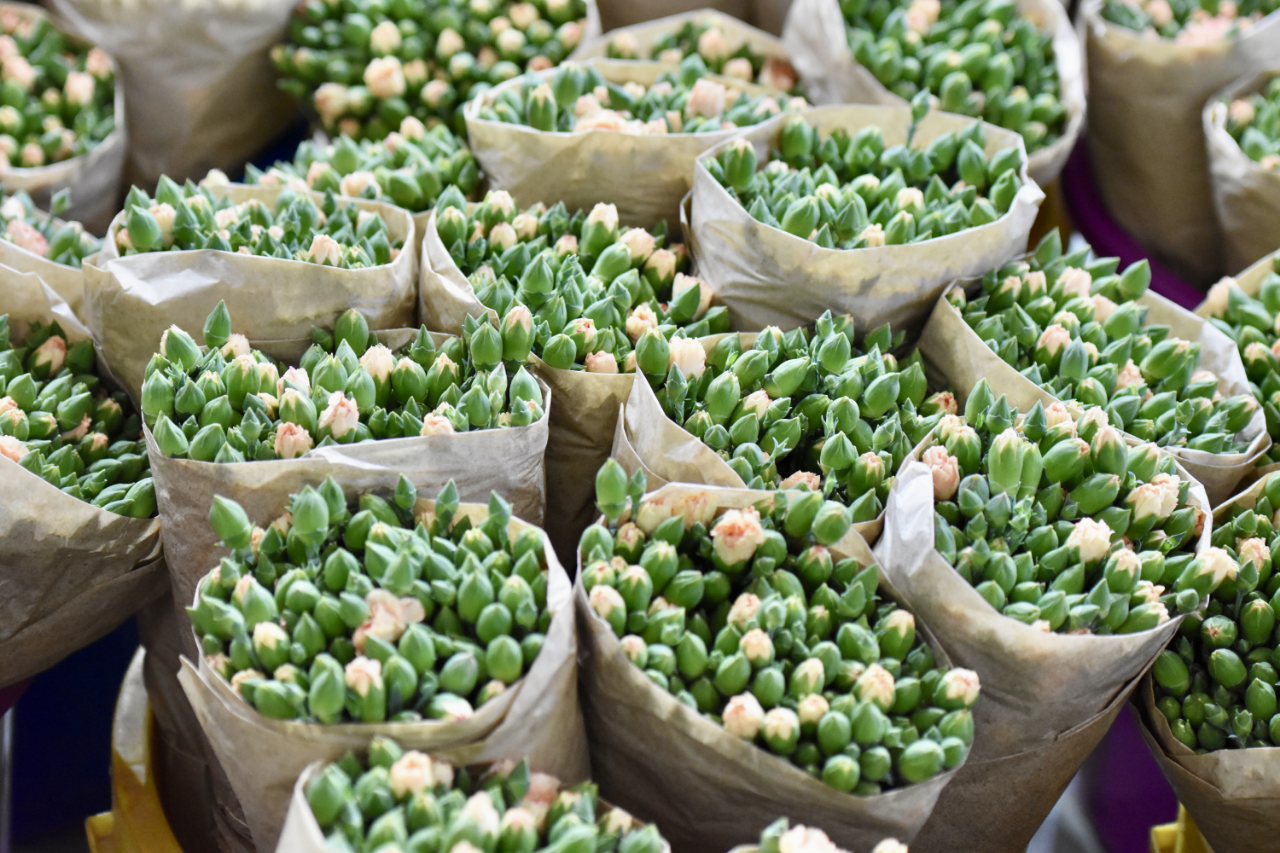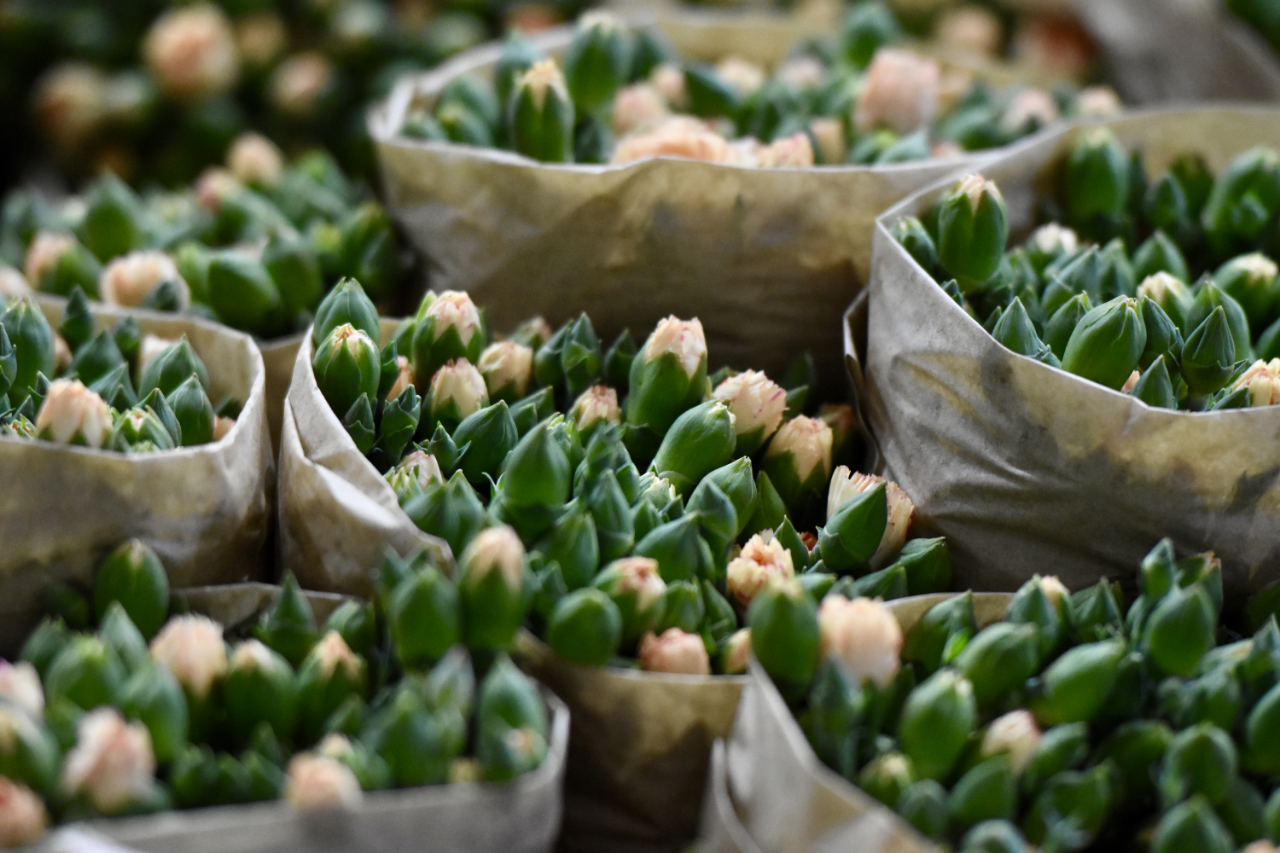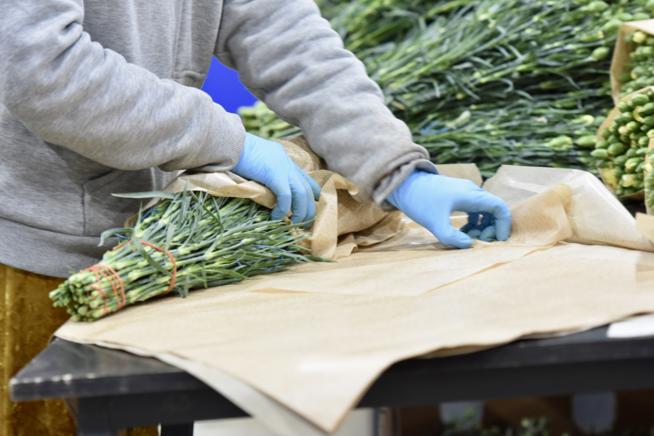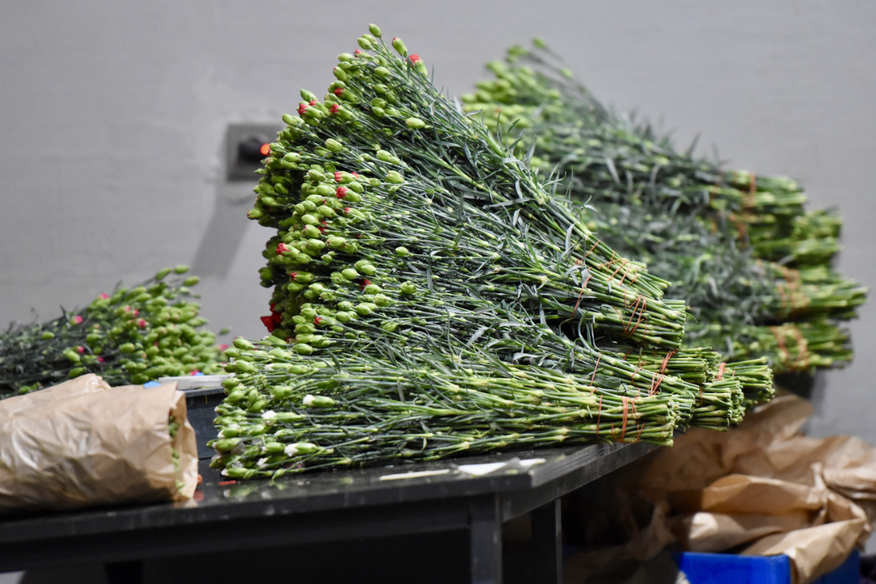 Toplanan kesme çiçekler, depolarda türlerine ve renklerine göre ayrılarak özenle paketleniyor.