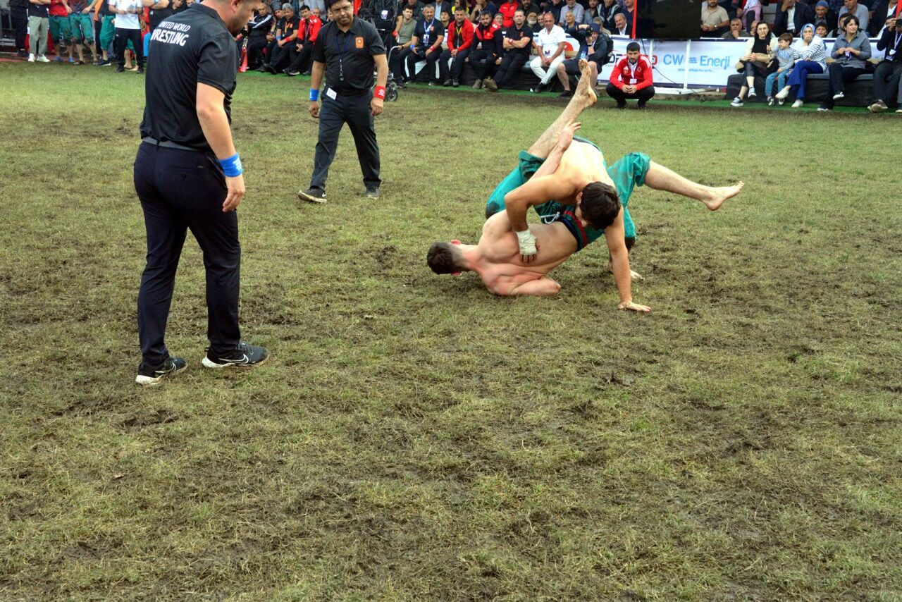 Güreşçiler, geleneksel kıyafetlerle er meydanında kıyasıya mücadele etti.