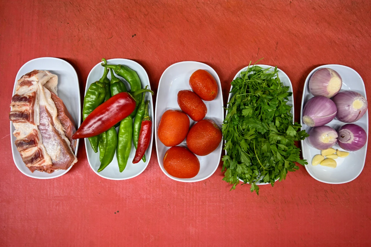 Maydanoz, taze kırmızı ve yeşil biber ile sarımsak etle birlikte zırhtan geçiriliyor.