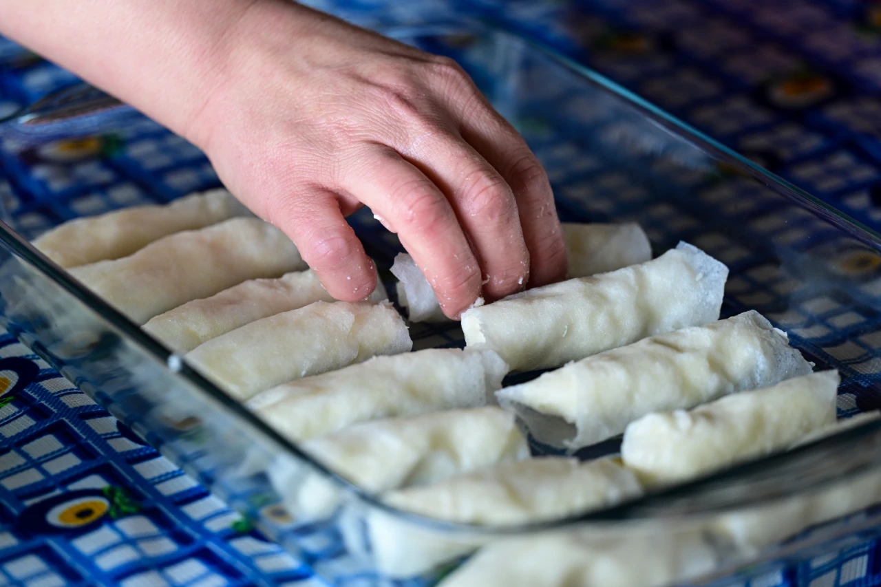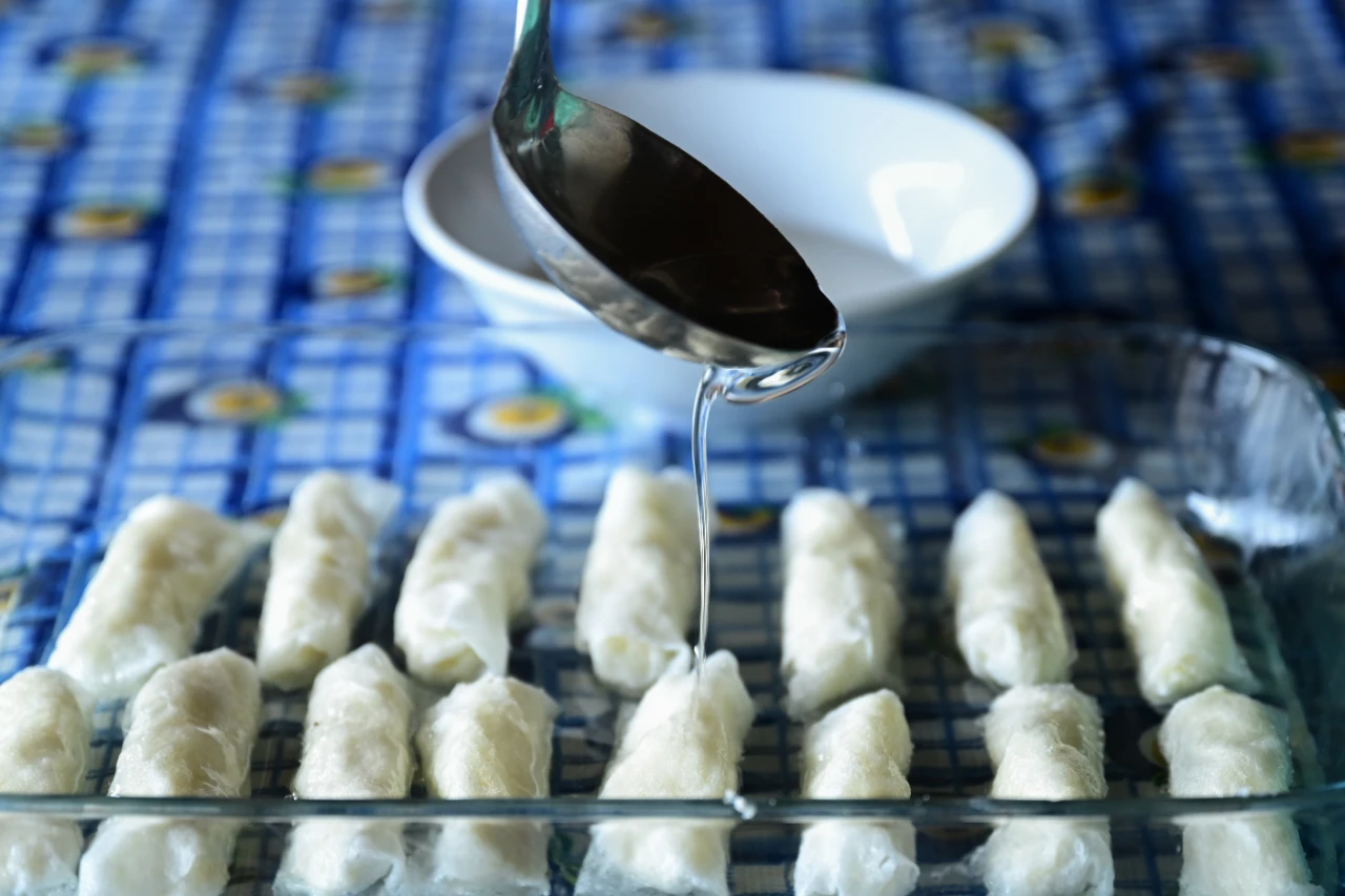 Hazırlanan kesmik, ıslatılmış güllaç yapraklarına sarılıyor ve üzerine kaynatılmış şerbet dökülerek dinlendiriliyor.