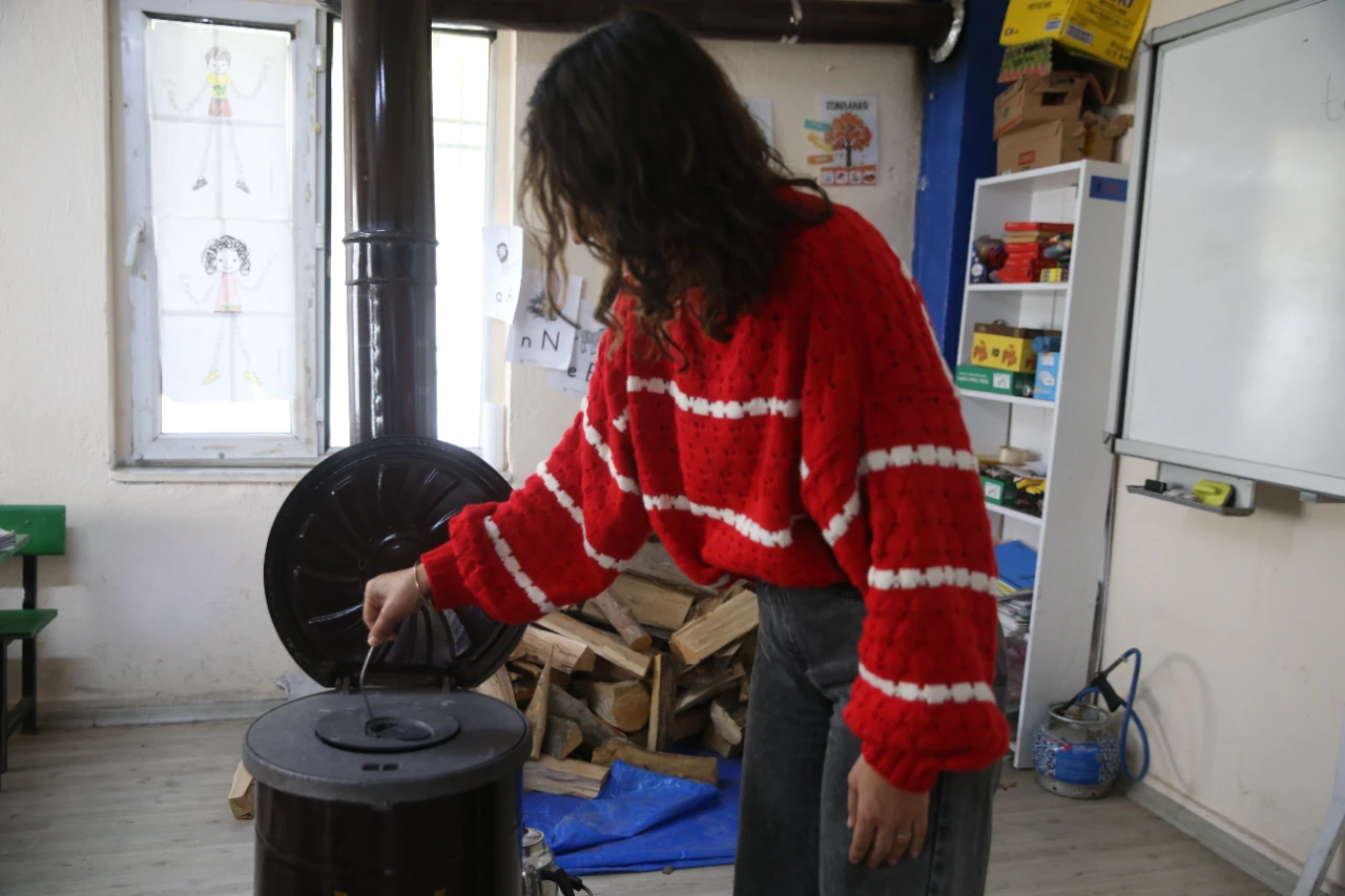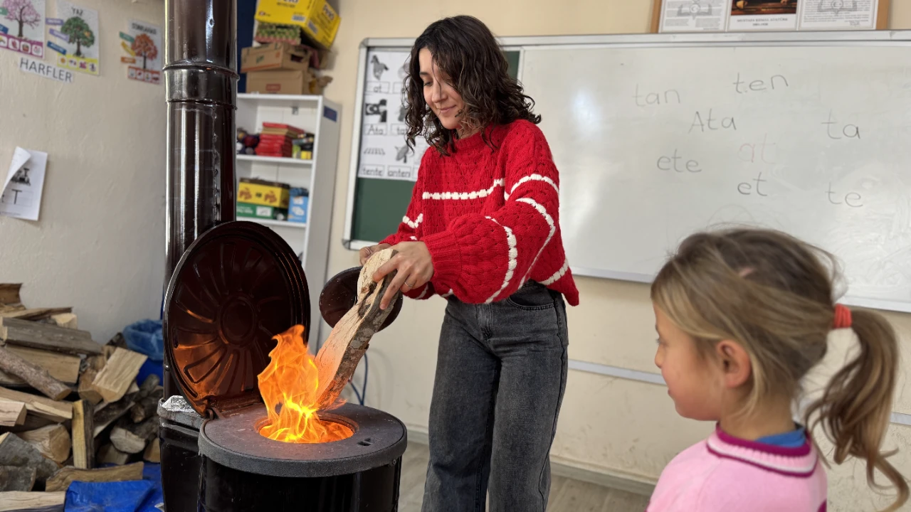 Derya öğretmen, her sabah öğrencilerinden önce sınıfa gelip sobayı yakıyor.
