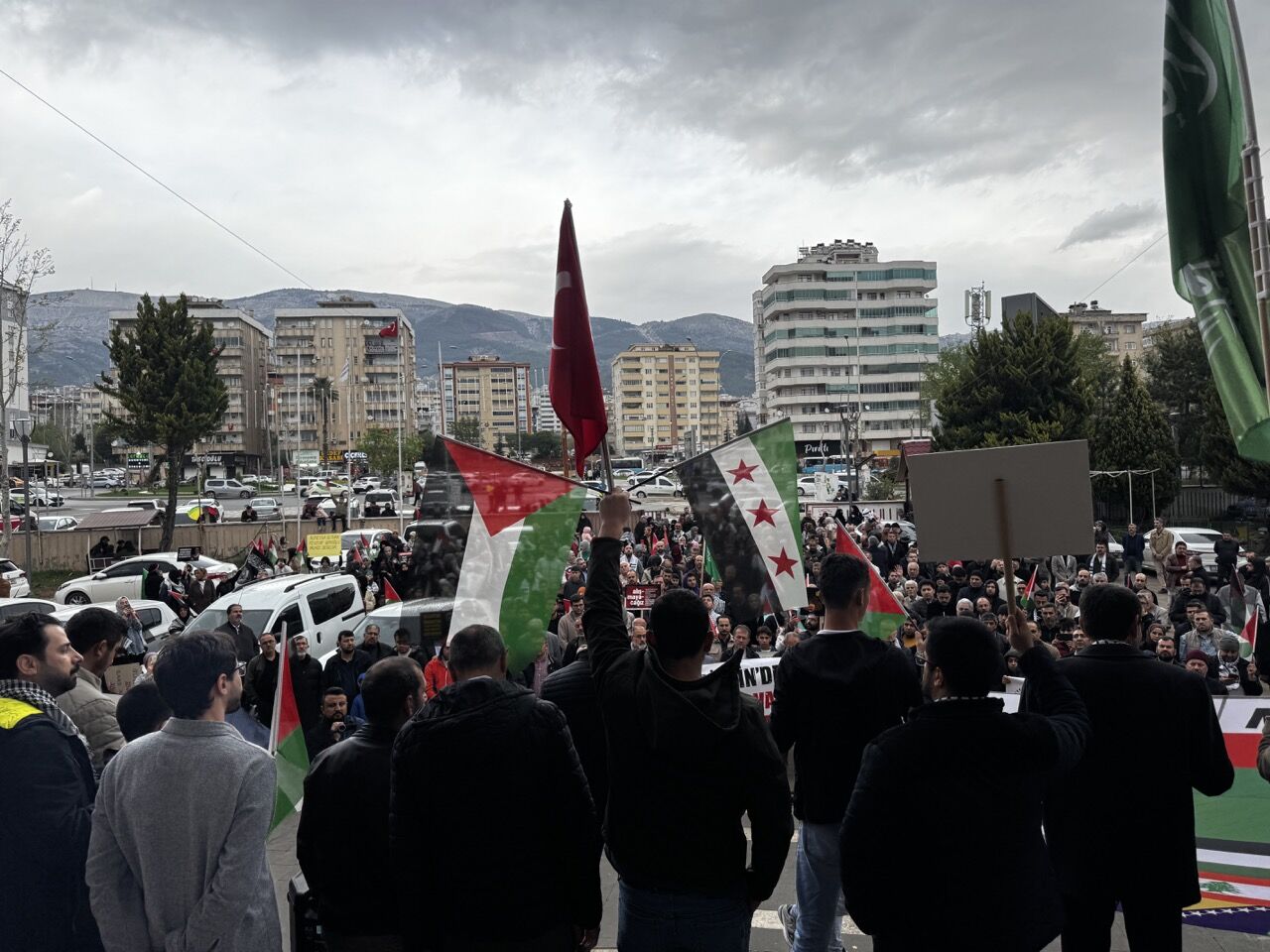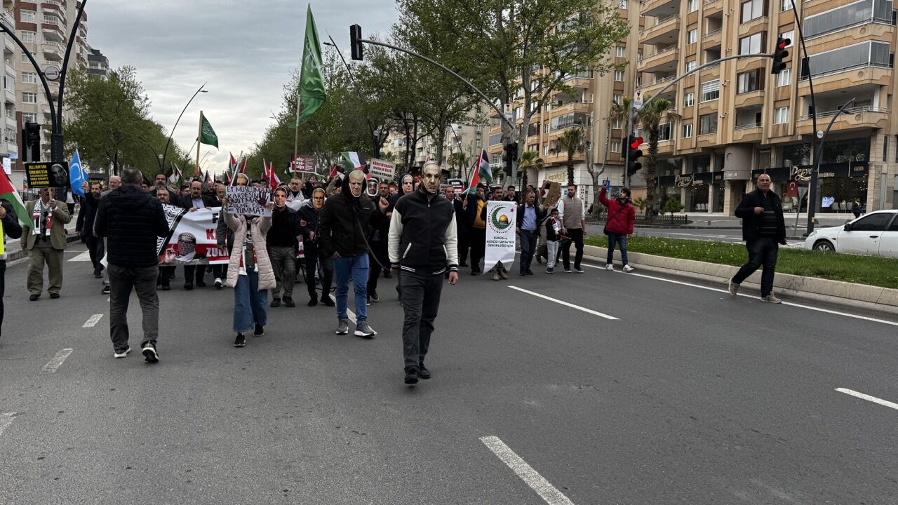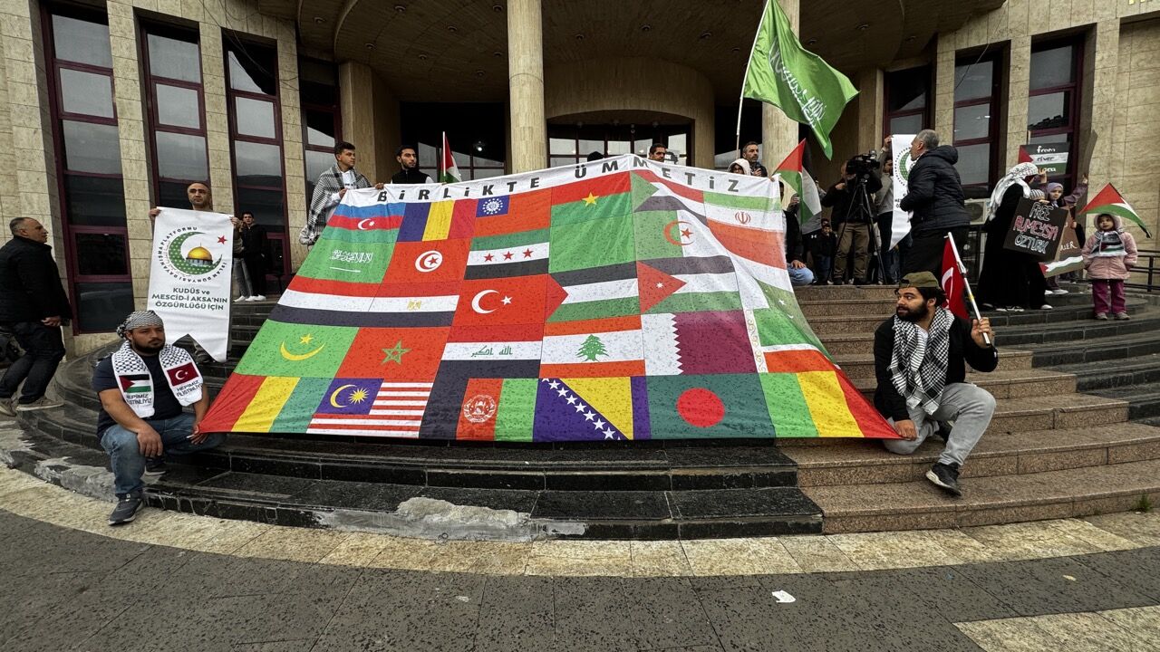 Esat Coşan Camisi önünde toplanan sivil toplum kuruluşlarının üyeleri ve vatandaşlar, ellerinde Türk ve Filistin bayraklarıyla "Filistin'e özgürlük", "Katil İsrail Filistin'den defol", "Kahrolsun İsrail", "Müslüman uyuma Filistin'e sahip çık", Gazze’ye direnişe bin selam" sloganları atarak Necip Fazıl Kültür Merkezi önüne yürüdü.