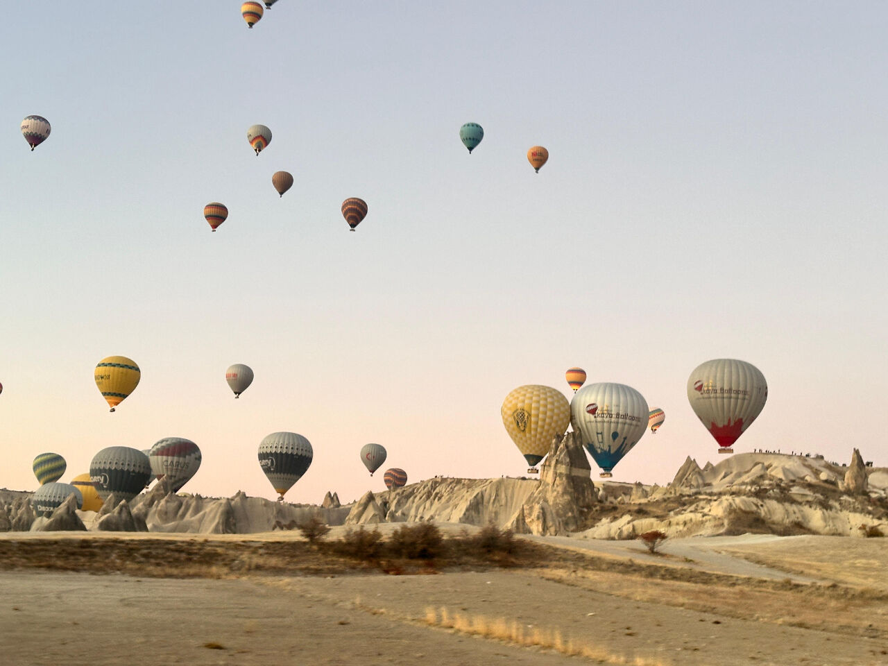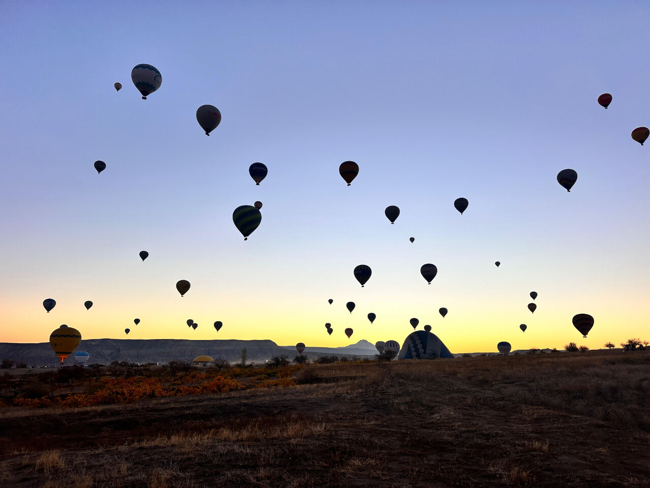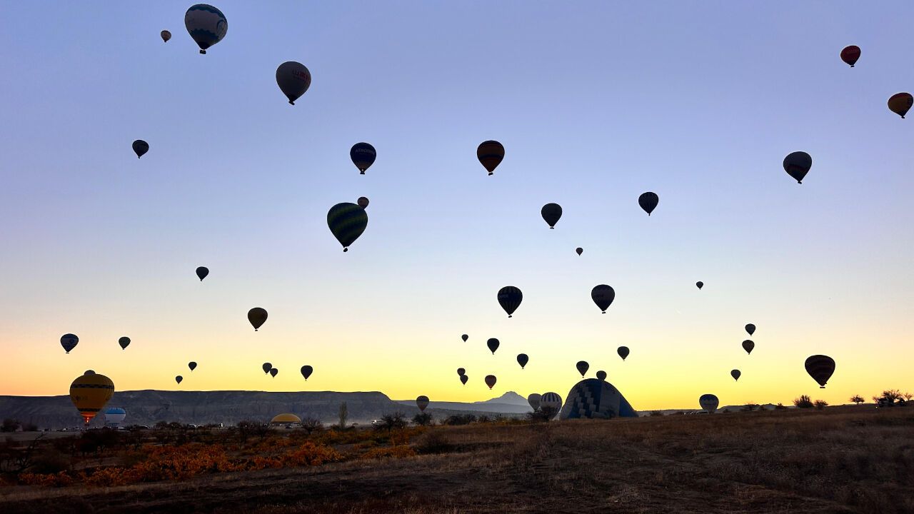 Kapadokya’da sabah saatlerinde balonlar, gökyüzünde görsel şölen sunuyor.