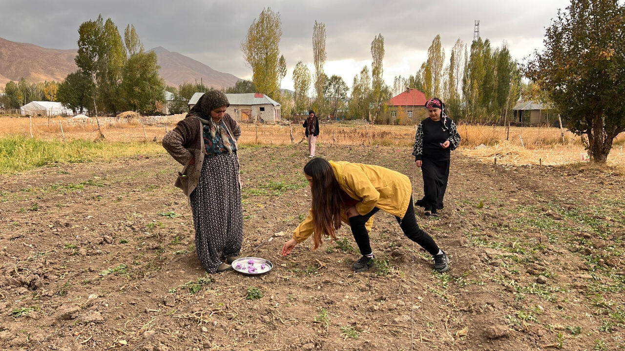 Bu ilk deneme, Yüksekova için yeni bir tarım sayfasının açılışı. Kadınlar, bu mor çiçeklerle geleceğe umut ekiyor.