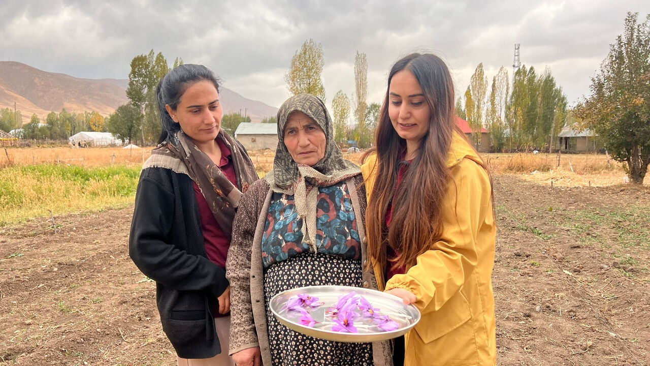 Kooperatif üyesi kadınlardan biri, ilk açan safran çiçeğini elinde tutarken... Gözlerindeki heyecan her şeyi anlatıyor.